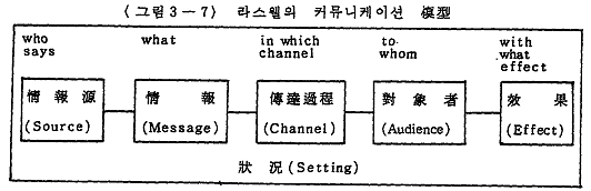 ¶ó½ºÀ£Àº(Lasswell)Àº Ä¿¹Â´ÏÄÉÀÌ¼Ç ±¸¼º¿ä¼Ò¸¦ ´©°¡, ¹«¾ùÀ», ¾î¶² ä³ÎÀ» ÅëÇØ, ´©±¸¿¡°Ô ¾î¶² È¿°ú¸¦ °¡Áö°í ¸»ÇÏ´À³Ä ¶ó´Â ½ÄÀ¸·Î ºÐ·ùÇÏ¿´´Ù.