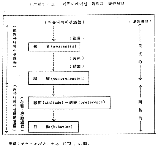 ¸ÕÀú ¸Þ½ÃÁö¿¡ÀÇ ÁÖ¸ñ°úÁ¤À¸·ÎºÎÅÍ ½ÃÀÛÇÏ¿© Áö¸í(awareness)ÀÌ ÀϾ ¼Ò±¸´ë»óÀÚÀÇ Èï¹Ì¸¦ ºÒ·¯ÀÏÀ¸ÄÑ ¸Þ½ÃÁö¸¦ Á¤µ¶ÇÔÀ¸·Î½á ÀÌÇØ(comprehension)¸¦ ³ôÀÏ ¼ö ÀÖ´Ù. ¸Þ½ÃÁöÀÇ ÀÌÇØ°¡ ³ô¾ÆÁü¿¡ µû¶ó »óǰ¿¡ ´ëÇÑ Åµµ(attitude)¿¡ ÀÖ¾î ¼±È£(preference) º¯È°¡ »ý°Ü ÃÖÁ¾ÀûÀ¸·Î »óǰÀÇ ±¸¸Å¿Í ½Ã¿ëÀ̶ó´Â Çൿ(behavior)ÀÌ ÀϾ°Ô µÈ´Ù.