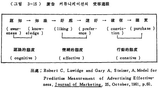 ¾Æ¿ï·¯ ¶óºñÁö, ½ºÅ¸´Ï¾î(LAVIDGE AND STEINER)ÀÇ ¨ç Awarness ¡æ ¨è Knowledge ¡æ¨é LiKing ¡æ ¨ê Preference ¡æ ¨ë Convictoin ¡æ ¨ì PurchaseÀÇ ¸ðµ¨µµ Àß ¾Ë·ÁÁ® ÀÖ´Ù. À̵éÀº <±×¸² 3-15>¿¡¼ º¸´Â °Í °°ÀÌ ÅµµÀÇ ¼¼ °¡Áö Â÷¿ø¿¡ µû¶ó ±¤°íÀÇ ¼ö¿ë°úÁ¤À» 6 ´Ü°è·Î ³ª´©°í ÀÖ´Ù.