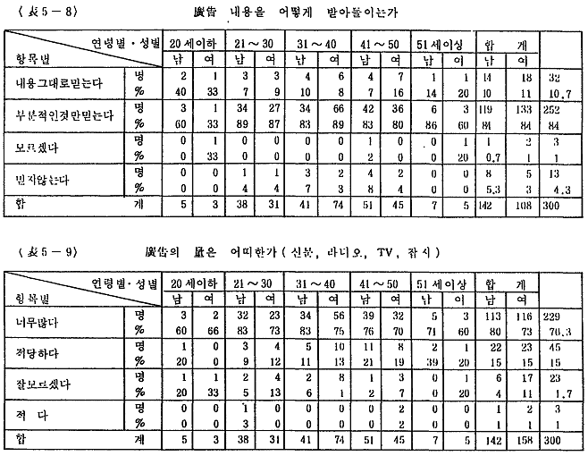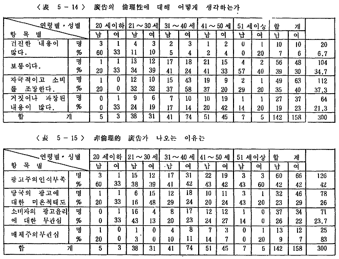 <Ç¥5-14>¿¡ º¸¸é ±¤°í¿¡ ´ëÇØ ¡¸°ÇÀüÇÑ ³»¿ëÀÌ ¸¹´Ù¡¹´Â 6.7%¿¡ ºÒ°úÇßÀ¸¸ç ¡¸ÀÚ±ØÀûÀÌ°í ¼Òºñ¸¦ Á¶ÀåÇÑ´Ù¡¹°¡ 37.7%, ¡¸°ÅÁþÀ̳ª °úÀåµÈ ³»¿ëÀÌ ¸¹´Ù¡¹°¡ 21.3%·Î ³ªÅ¸³ª°í ÀÖÀ¸¸ç ¡¸º¸ÅëÀÌ´Ù¡¹´Â 34.7%·Î ³ªÅ¸³Â´Ù. ¼ÒºñÀÚµéÀº ±¤°í°¡ °ÇÀüÇÑ ³»¿ëÀ̶ó°í ¹ÏÁö ¾Ê°í °úÀåµÇ°í ¼Òºñ¸¦ Á¶ÀåÇÑ´Ù°í ÀνÄÇϰí ÀÖÀ¸¸ç, ÀÌ¿Í °°Àº Çö»óÀº ±³Á÷ÀÚ¿¡°Ô ´õ¿í µÎµå·¯Áö°Ô ³ªÅ¸³ª°í ÀÖ´Ù.