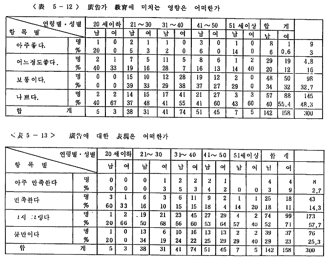 <Ç¥5-12>¿¡¼ º¸¸é ¡¸³ª»Ú´Ù¡¹´Â 48.3%À̰í, ¡¸¾î´À Á¤µµ ÁÁ´Ù¡¹´Â 16%, ¡¸¾ÆÁÖ ÁÁ´Ù¡¹´Â 3%À̰í, ¡¸º¸ÅëÀÌ´Ù¡¹°¡ 32.7%ÀÌ´Ù. ±¤°í°¡ ±³À°ÀûÀ¸·Î ÁÁÀº °ÍÀ¸·Î ³ªÅ¸³ªÁö ¾ÊÀº °ÍÀ¸·Î º¸¾Æ ±¤°í¿¡ ÀÖ¾î¼ ÇãÀ§, °úÀåÀÌ ¾ÆÁ÷µµ Á¤ÈµÇÁö ¸øÇÏ°í ¼öÁØÀÌ ³·´Ù´Â °ÍÀ» Áõ¸íÇÏ´Â °ÍÀÌ´Ù.