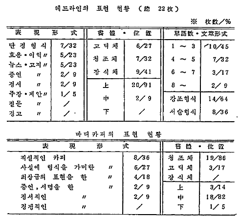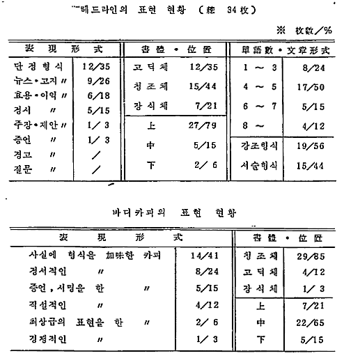 Çìµå¶óÀÎÀÇ Ç¥ÇöÀº ´ÜÁ¤Çü½ÄÀÌ Æò±ÕÄ¡ 27%ÀÇ °ÅÀÇ µÎ ¹èÀÎ 53%À̰í, ±× ´ÙÀ½ÀÌ Á¤¼Çü½ÄÀÌ´Ù. Çìµå¶óÀÎÀÇ ¹®ÀåÇü½ÄÀº ¾à 90%°¡ °Á¶Çü½ÄÀ¸·Î µÇ¾î ÀÖ¾ú´Ù. ¹ÙµðÄ«ÇÇÀÇ Ç¥Çö¿¡ ÀÖ¾î Á¤¼ÀûÀÎ Çü½ÄÀÌ ¸¹¾Ò´Âµ¥, ÁÖ·Î ¼Ò±¸´ë»óÀÌ ¿©¼ºÀÎ Á¦Ç° ±¤°í¿´´Ù.