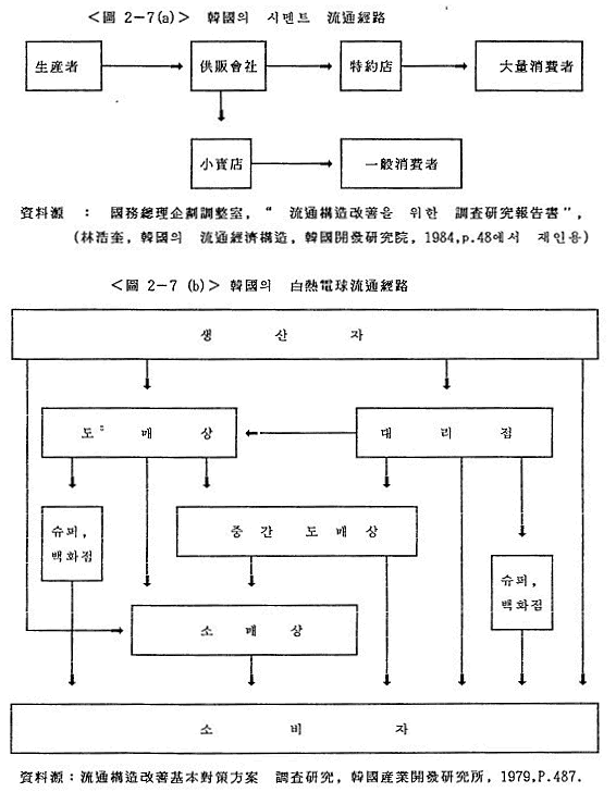 Çѱ¹ÀÇ À¯Åë°æ·Î´Â Á¦Ç°¿¡ µû¶ó Â÷À̰¡ ¸¹À¸¹Ç·Î ´ëÇ¥ÀûÀ¸·Î »ý»êÀçÀÇ À¯Åë°æ·Î·Î¼ ½Ã¸àÆ® À¯Åë°æ·Î¿Í ¼ÒºñÀçÀÇ À¯Åë°æ·Î·Î¼ ¹é¿Àü±¸ÀÇ À¯Åë°æ·Î¸¦ µµ½ÃÇϸé <µµ 2-7 (a), (b)>¿Í °°´Ù.