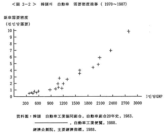 Çѱ¹ÀÇ ÀÚµ¿Â÷ ¼ö¿ä´Â ÀϺ»À̳ª ¹Ì±¹°ú ºñ±³ÇÒ ¶§ ¾ÆÁ÷ Àú¼öÁØ¿¡ ¸Ó¹°°í ÀÖÀ¸³ª <µµ 3-2>¿¡¼ º¸´Â ¹Ù¿Í °°ÀÌ 1Àδç GNP $750±îÁö´Â ¿Ï¸¸ÇÑ Áõ°¡¸¦ º¸ÀÌ´Ù°¡ $750~$1,500»çÀÌ¿¡´Â ¼ö¿äÁõ°¡°¡ °¡¼ÓȵǸç $1,500ÀÌÈÄ¿¡´Â ¸Å¿ì ±Þ°ÝÇÑ Áõ°¡¸¦ º¸À̰í ÀÖ´Ù.