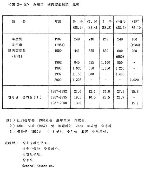 ÀÚµ¿Â÷ ¼ö¿ä¿¹Ãø¿¡ °üÇÑ ¿¬±¸°á°ú¸¦ Á¾ÇÕÇØ º¸¸é <Ç¥ 3-5>¿Í °°Àºµ¥ 1992³âÀÇ °æ¿ì °¡Àå ³«°üÀû Àü¸ÁÄ¡ÀÎ ´ë¿ìÀÇ 110¸¸´ë´Â º¸¼öÀûÀÎ GMÀÇ 43.5¸¸´ëÀÇ 2¹è¸¦ »óȸÇϰí ÀÖ´Ù. ±×·±µ¥ ¿ì¸®³ª¶óÀÇ ÀÚµ¿Â÷ º¸±ÞÀ²ÀÌ ±ØÈ÷ ³·Àº °ÍÀ» °¨¾ÈÇÑ´Ù¸é 100¸¸´ë ÀÌ»óÀÇ ¼ö¿ä´Â ³«°üÀûÀ̶ó°í º»´Ù.