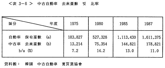 Çѱ¹ÀÇ ÀÚµ¿Â÷ º¸À¯´ë¼ö ´ë Áß°íÂ÷ °Å·¡ºñÀ²Àº ¾à 12%·Î 1987³â¿¡´Â 178,821´ëÀÇ Áß°íÂ÷°¡ °Å·¡µÇ¾ú´Ù. <Ç¥ 3-6>
