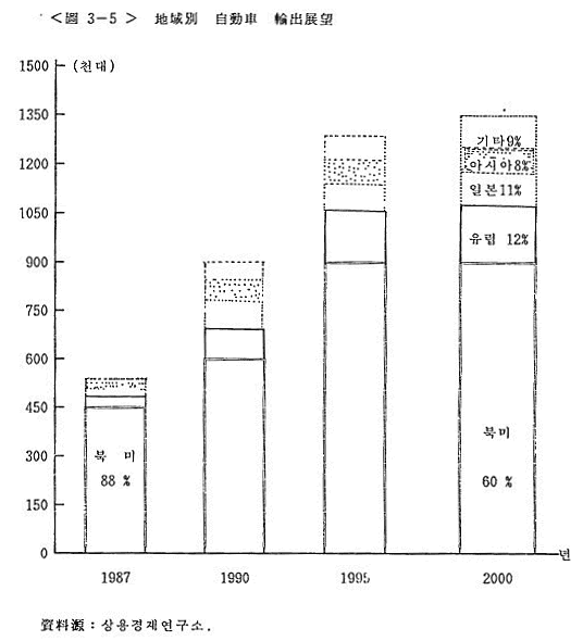 ÀÚµ¿Â÷»ê¾÷ÀÇ ¼ºÀåÀ¸·Î 1975³â ¼öÃâÀÌ ½ÃÀÛµÈ ÀÌ·¡ 1987³â¿¡´Â 546,310´ë¸¦ ¼öÃâÇÏ¿© ±Þ¼ÓÇÑ ¼ºÀåÀ» ÀÌ·ç¾î ¿Ô´Ù. 1987³â±îÁö ÀÚµ¿Â÷ ¼öÃâÀº 88%°¡ ºÏ¹Ì¿¡ ÆíÁߵǾî ÀÖ¾î Á¦Á¶¾÷ü°¡ Á÷Á¢ ¼öÃâ±îÁö ´ã´çÇÏ´Â °ÍÀÌ °¡´ÉÇÏ¿´À¸³ª ¾ÕÀ¸·Î <µµ 3-5>¿Í °°ÀÌ ¼öÃâÁö¿ªÀÌ À¯·´, ÀϺ», ¾Æ½Ã¾Æ µîÀ¸·Î ´Ùº¯ÈµÇ°í ¼öÃâ·®ÀÌ ¸¹¾ÆÁö¸é ¼öÃâÀ» ´ëÇàÇÒ µô·¯°¡ ÇÊ¿äÇÏ°Ô µÇ´Âµ¥ µô·¯¸¦ µµÀÔÇÔÀ¸·Î½á ±¹Á¦½ÃÀå¿¡¼ Á¦±âµÇ´Â ´ýÇι®Á¦Çذá, ¼öÃâ´ë»ó±¹ÀÇ ÀÌÁúÀûÀÎ À¯Åëȯ°æ¿¡ ´Éµ¿Àû ´ëó µîÀ» ÅëÇÑ ¼öÃâ¾÷¹«ÀÇ È¿À²¼ºÀ» ³ôÀÏ ¼ö ÀÖ´Ù.
