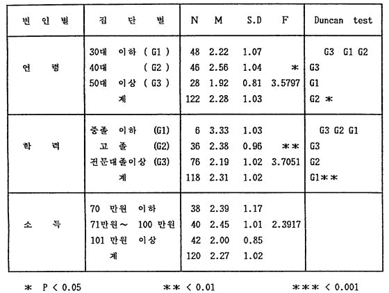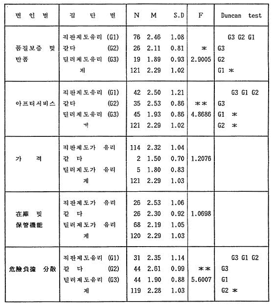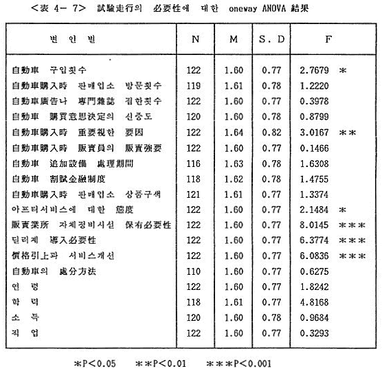 <Ç¥ 4-6>¿¡ ÀÇÇÏ¸é ¸ðµç µ¶¸³º¯¼ö¿¡ µû¶ó µô·¯Á¦ µµÀÔ Çʿ伺ÀÌ ³ªÅ¸³µ´Ù. ÀÚµ¿Â÷ ±¸ÀÔȽ¼öº° µô·¯Á¦ µµÀÔ¿¡ ´ëÇÑ À¯Àǵµ 0.01¼öÁØ¿¡¼ F°ªÀÌ 4.3246À¸·Î¼ Áý´Ü°£ Æò±ÕÀÇ Â÷ÀÌ´Â Åë°èÀûÀ¸·Î À¯ÀÇÇÏ´Ù°í ÇÒ ¼ö ÀÖÀ¸¸ç °¢ Áý´Ü »óÈ£°£ÀÇ Â÷À̸¦ »çÈİËÁõÇÑ °á°úÇ¥¸¦ º¸¸é, 1ȸ ±¸ÀÔÁý´Ü°ú 3ȸ ±¸ÀÔÁý´Ü°£¿¡ µô·¯Á¦ µµÀÔ¿¡ ´ëÇÑ Åµµ¿¡¼ Â÷À̸¦ º¸À̰í ÀÖ´Â °ÍÀ¸·Î ³ªÅ¸³µ´Âµ¥, Pearson's R°ªÀÌ -0.2769(P=0.01)ÀÎ °ÍÀ¸·Î º¸¾Æ ÀÚµ¿Â÷ ±¸ÀÔȽ¼ö°¡ ¸¹À»¼ö·Ï µô·¯Á¦ µµÀÔÀ» ´õ ÇÊ¿ä·Î ÇÏ´Â °ÍÀÓÀ» ¾Ë ¼ö ÀÖ´Ù. ±âŸ º¯¼öº° µô·¯Á¦ µµÀÔ¿¡ ´ëÇÑ Åµµ´Â ÀÚµ¿Â÷ ±¸ÀԽà ÆÇ¸Å¿µ¾÷¼Ò ¹æ¹®È½¼ö, ÀÚµ¿Â÷ ±¤°í³ª Àü¹®ÀâÁö¸¦ Á¢ÇÑ È½¼ö, ÀÚµ¿Â÷ ÆÇ¸Å¾÷¼ÒÀÇ ÀÚü Á¤ºñ½Ã¼³ º¸À¯Çʿ伺, ½ÃÇèÁÖÇàÀÇ Çʿ伺, µô·¯Á¦ µµÀÔÀ¸·Î ÀÎÇÑ °¡°ÝÀλó°ú ¼ºñ½º °³¼±, ±¸¸Å»ó´ãÀ̳ª Çù»óÀÇ Æí¸®¼º, »óǰ´Ù¾çÈ¿¡ ´ëÇÑ Åµµ¿¡ µû¶ó¼´Â À¯Àǵµ 0.001¼öÁØ¿¡¼ °¢ Áý´Ü°£¿¡ Â÷À̰¡ ³ªÅ¸³µÀ¸¸ç, Ãß°¡¼³ºñÁö¿¬¿¡ µû¸¥ ºÒÆíÁ¤µµ, À§ÇèºÎ´ãºÐ»ê¿¡ ´ëÇÑ Åµµ, ¾ÆÇÁÅͼºñ½º, Çз¿¡ µû¶ó¼´Â À¯Àǵµ 0.01¼öÁØ¿¡¼, ÀÚµ¿Â÷ ±¸ÀԽà Áß¿ä½ÃÇÑ ¿äÀÎ, ¿É¼Ç, ǰÁúº¸Áõ ¹× ¹Ýǰ, ¿¬·É¿¡ µû¶ó¼´Â À¯Àǵµ 0.05¼öÁØ¿¡¼ Áý´Ü°£¿¡ Â÷À̰¡ ³ªÅ¸³µ°í, ÀÚµ¿Â÷ ±¸¸ÅÀÇ»ç°áÁ¤ÀÇ ½ÅÁßµµ, ÀÚµ¿Â÷ ÇҺαÝÁ¦µµ, ÀÚµ¿Â÷ ±¸ÀÔ´ç½Ã ÆÇ¸Å¿µ¾÷¼ÒÀÇ »óǰ±¸»öÁ¤µµ, Á¦Ç° ¹× ½ÃÀåÁ¤º¸Á¦°ø, °¡°Ý, Àç°í ¹× º¸°ü±â´É, ÀÚµ¿Â÷ÀÇ Ã³ºÐ¹æ½Ä, ¼Òµæ¿¡ µû¶ó¼´Â Áý´Ü°£¿¡ Â÷À̰¡ ³ªÅ¸³ªÁö ¾Ê°í ÀÖ´Ù.