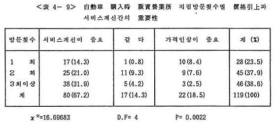 µô·¯Á¦ µµÀÔÀ¸·Î ÀÎÇÑ °¡°ÝÀλó°ú ¼ºñ½º °³¼±°£ÀÇ Á߿伺Àº ÀÚµ¿Â÷ ±¸ÀԽà ÆÇ¸Å¿µ¾÷¼Ò Á÷Á¢¹æ¹®È½¼ö¿¡ µû¶ó Â÷À̰¡ ÀÖ´Ù. <Ç¥ 4-9>