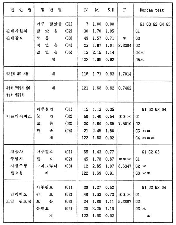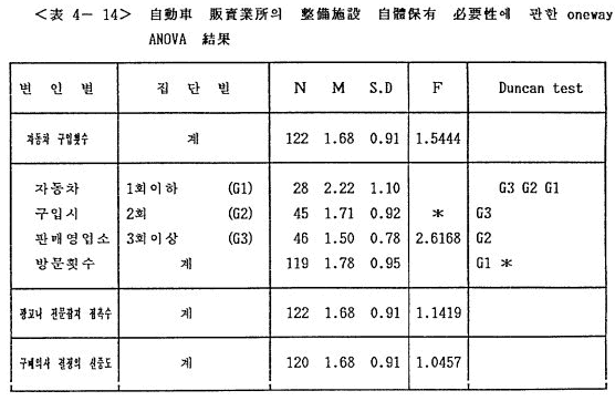 ÀÚµ¿Â÷ ÆÇ¸Å¾÷¼ÒÀÇ Á¤ºñ½Ã¼³ ÀÚüº¸À¯ Çʿ伺¿¡ ´ëÇÑ Åµµ¸¦ ºÐ¼®Çϱâ À§ÇØ Á¾¼Óº¯¼öÀÎ Á¤ºñ½Ã¼³ ÀÚüº¸À¯ Çʿ伺¿¡ ´ëÇÑ Åµµ¸¦ 5µîºÐÇÏ¿© ¡¸¾ÆÁÖÇʿ䡹 1Á¡, ¡¸Çʿ䡹 2Á¡, ¡¸º¸Å롹 3Á¡, ¡¸ºÒÇʿ䡹 4Á¡, ¡¸ÀüÇô ºÒÇʿ䡹 5Á¡À¸·Î Æò°¡ÇÏ¿´À¸¹Ç·Î Æò±ÕÄ¡°¡ ³·À»¼ö·Ï Á¤ºñ½Ã¼³ ÀÚüº¸À¯ Çʿ伺ÀÌ ³ôÀº °ÍÀε¥, °¢ µ¶¸³º¯¼öº° Á¤ºñ½Ã¼³ ÀÚüº¸À¯ Çʿ伺ÀÇ Æò±ÕÄ¡¿Í Ç¥ÁØÆíÂ÷´Â <Ç¥ 4-14>¿Í °°´Ù.