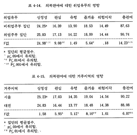 ÀǺ¹°ü¿©ÀÇ °¢ Â÷¿ø°ú ÃѰü¿©ÀÇ ¼öÁØÀÌ °ÅÁÖÁö¿ª¿¡ µû¶ó À¯ÀÇÇÑ Â÷À̰¡ Àִ°¡¸¦ ÀÏ¿øºÐ»êºÐ¼®À¸·Î °ËÁ¤ÇÑ °á°ú´Â Ç¥ 4-15¿¡ Á¦½ÃµÇ¾î ÀÖ´Â ¹Ù¿Í °°´Ù. ¼¿ï¿¡ °ÅÁÖÇÏ´Â ÁֺεéÀÌ ÀǺ¹¿¡ ´ëÇÑ °ü½ÉÀÌ ¸¹À¸¸ç À¯Çà¿¡ ´õ¿í °ü¿©Çϰí ÀǺ¹¿¡ ÀÇÇÑ Áñ°Å¿òÀ» ´õ¿í ´À³¢´Â ÆíÀ̸ç ÀüüÀûÀ¸·Î ÀǺ¹¿¡ ´õ¿í °ü¿©ÇÏ´Â °æÇâÀÌ ÀÖ¾ú´Ù. ÀÌ·¯ÇÑ °á°ú´Â ¼¿ïÀÌ ´ëÀüº¸´Ù ´õ Å« µµ½ÃÀ̸ç ÀǺ¹¿¡ ´ëÇÑ ÀÚ±ØÀÌ ´õ ¸¹Àºµ¥¼ ¿¬À¯µÈ °ÍÀ¸·Î ÇØ¼®µÉ ¼ö ÀÖÀ» °ÍÀÌ´Ù.