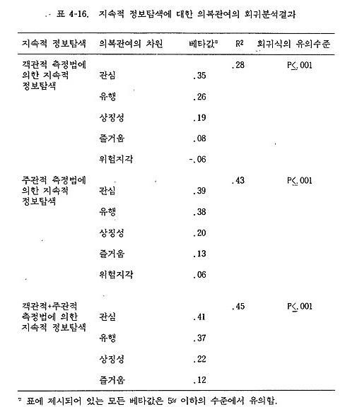 ´ëÁ߸Åü Ž»öÀº Áö¼ÓÀû Á¤º¸Å½»öÀÌ ¸¹°í ÀǺ¹ÀÇ À¯Çà°ú »ó¡¼º¿¡ ´õ¿í °ü¿©Çϸç, ÁÖºÎÀÇ ÇзÂÀÌ ³·°í Á÷¾÷À» °®Áö ¾Ê¾ÒÀ¸¸ç, ÀǺ¹ÀÇ ±¸¸Åºóµµ°¡ ³·Àº ÁֺεéÀÇ °æ¿ì¿¡ ³ôÀº °æÇâÀ» ³ªÅ¸³»¾ú´Ù. ÀÌµé º¯¼öµé¿¡ ÀÇÇÑ ¼³¸í·ÂÀº 24%À̾ú´Ù. ÁֺεéÀº Áö¼ÓÀû Á¤º¸Å½»öÀ» ¸¹ÀÌ ÇÏ°í ³²ÆíÀÇ ÇзÂÀÌ ³·À¸¸ç ÀǺ¹ÀÇ ±¸¸Å°¡°ÝÀÌ ºñ½Ò¼ö·Ï ½ÇÁ¦ÀûÀÎ °üÂûÀ» À§ÁÖ·Î ÇÑ Á¡Æ÷Ž»öÀ» ´õ ¸¹ÀÌ ÇÏ´Â °æÇâÀÌ ÀÖ¾ú´Ù. ¼¼ º¯¼öµé¿¡ ÀÇÇÑ Àüü ºÐ»êÀÇ ¼³¸í·ÂÀÌ 26%À̾ú´Ù. ¶ÇÇÑ Áö¼ÓÀû Á¤º¸Å½»öÀ» ¸¹ÀÌ Çϸç ÀǺ¹¿¡ Áö¼ÓÀûÀÎ °ü½ÉÀÌ Àû°í Ãë¾÷À» ÇÏÁö ¾ÊÀº ÁֺεéÀÇ °æ¿ì¿¡ Àμâ¸Åü¸¦ ÀÌ¿ëÇÑ Á¤º¸Å½»öÀÌ ¸¹Àº °ÍÀ¸·Î ³ªÅ¸³µÀ¸¸ç À̵鿡 ÀÇÇÏ¿© ºÐ»êÀÇ 26%°¡ ¼³¸íµÇ¾ú´Ù. Áö¼ÓÀû Á¤º¸Å½»öÀ» ¸¹ÀÌ Çϰí ÁÖºÎÀÇ ÇзÂÀÌ ³·À¸¸ç ±¸¸Åºóµµ°¡ ³ô°í ÀǺ¹ÀÇ »ó¡¼º¿¡ ´õ¿í °ü¿©Çϸç ÀǺ¹¿¡ ´ëÇÏ¿© Áö¼ÓÀûÀÎ °ü½ÉÀÌ ÀûÀ»¼ö·Ï ÀÎÀûŽ»öÀ» ¸¹ÀÌ ÇÏ´Â °æÇâÀÌ ÀÖ¾ú´Ù. ´Ù¸¥ Á¤º¸Å½»ö À¯Çü¿¡ ºñÇÏ¿© Áö¼ÓÀû Á¤º¸Å½»öÀÇ ¿µÇâÀÌ ÀûÀº ÆíÀ̾ú°í ÁֺεéÀÇ ÇзÂÀÌ »ó´ëÀûÀ¸·Î ¿µÇâÀ» Å©°Ô ¹ÌÄ¡´Â °ÍÀ¸·Î ³ªÅ¸³µ´Ù. ÀÌ º¯¼öµé¿¡ ÀÇÇÑ ºÐ»êÀÇ ¼³¸í·ÂÀº 10%·Î½á Àüü Ž»öÀÎÀÚ Áß °¡Àå ³·¾Ò´Ù. ÆÐ¼Ç Àü¹®ÀâÁö¿Í Àü¹®°¡ÀÇ Á¶¾ð, īŻ·Î±×¸¦ ÀÌ¿ëÇÑ Á¤º¸Å½»ö¿¡´Â Áö¼ÓÀû Á¤º¸Å½»öÀÌ °¡Àå Å« Á¤Àû ¿µÇâÀ» ¹ÌÄ¡°í ÀÖ¾úÀ¸¸ç, ÀǺ¹¿¡ Áö¼ÓÀûÀÎ °ü½ÉÀÌ Àû°í ÀǺ¹¿¡ ÀÇÇÑ Áñ°Å¿ò¿¡ ´ú °ü¿©Çϸç, ÁÖºÎÀÇ ÇзÂÀÌ ³·°í ÀǺ¹ÀÇ ±¸¸Å°¡°ÝÀÌ ºñ½Ò¼ö·Ï Àü¹®Àû Ž»öÀ» ¸¹ÀÌ ÇÏ´Â °æÇâÀÌ ÀÖ¾ú´Ù. ÀÌ·¯ÇÑ 5°¡Áö º¯¼öµé¿¡ ÀÇÇÏ¿© ÀüüºÐ»êÀÇ 34%°¡ ¼³¸íµÇ¾ú´Ù. ¸¶Áö¸·À¸·Î Áö¼ÓÀû Á¤º¸Å½»öÀÌ ¸¹À¸¸ç, ÀǺ¹ÀÇ »ó¡¼º¿¡ ´õ¿í °ü¿©Çϰí ÀǺ¹¿¡ ´ëÇÑ Áö¼ÓÀû °ü½ÉÀÌ ÀûÀ¸¸ç, ÁÖºÎÀÇ ÇзÂÀÌ ³·°í Á÷¾÷À» °®Áö ¾Ê¾ÒÀ¸¸ç, ÀǺ¹ÀÇ ±¸¸Å°¡°ÝÀÌ ºñ½Ñ °æ¿ì¿¡ ¿©·¯ ÃâóµéÀ» ÀÌ¿ëÇÑ ÃÑŽ»ö·®ÀÌ ¸¹¾Ò´Ù. ÀÌ·¯ÇÑ º¯¼öµé¿¡ ÀÇÇÏ¿© Àüü ºÐ»êÀÇ 35%°¡ ¼³¸íµÇ¾ú´Ù.