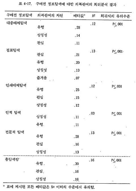 ÀÌ·¯ÇÑ °á°ú´Â »óǰ°ü¿© ¼öÁØÀÌ ¿ÜÀû Á¤º¸Å½»öȰµ¿¿¡ À¯ÀÇÇÑ Á¤Àû °ü·ÃÀ» °®´Â´Ù°í º¸°íÇÑ ¿©·¯ ¼±Ç࿬±¸µéÀ» ÁöÁöÇÏ¿´´Ù. (À̱⿱, 1984: Zaichkowsky, 198sa: Laurent°ú Kapferer,1985: Richins¿Í Bloch, 1986: Srinivasan, 1987: Mcquarrie¿Í Munson, 1987: ÀÌ¿µ°æ, 1987: Higie¿Í Feick, 1989) TV¿Í ¶óµð¿À, ½Å¹®ÀÇ ±¤°í¸¦ À§ÁÖ·Î ÇÑ Á¤º¸Å½»ö¿¡´Â ÀǺ¹ÀÇ À¯Çà°ú »ó¡¼º, °ü½É Â÷¿øÀÌ 'À¯ÀÇÇÑ Á¤Àû °ü·ÃÀ» °®À¸¸ç ¼¼ º¯¼öµé¿¡ ÀÇÇÑ ºÐ»êÀÇ ¼³¸í·ÂÀº 12%À̾ú´Ù. ÁֺεéÀÌ ±¸¸ÅÀü Ž»ö´Ü°è¿¡¼ °¡Àå ¸¹ÀÌ ÀÌ¿ëÇÏ´Â Á¤º¸¿øÀÎ ¼îÀ©µµ Áø¿°ú Á¡Æ÷³» Áø¿, °Å¸®¿Í ÁÖº¯°üÂû¿¡´Â ÀǺ¹¿¡ ´ëÇÑ °ü½É°ú À¯Çà, »ó¡¼º, Áñ°Å¿ò Â÷¿ø ÀÌ À¯ÀÇÇÑ Á¤Àû °ü°è¸¦ °®À¸¸ç À̵鿡 ÀÇÇÑ Á¡Æ÷Ž»ö ÀÎÀÚÀÇ ¼³¸í·ÂÀº 13%À̾ú´Ù. ÀâÁöÀÇ ±¤°í¿Í ±â»ç, ½Å¹®ÀÇ ±â»ç¸¦ ÅëÇÏ¿© ±¸¸ÅÀü¿¡ ÀǺ¹¿¡ ´ëÇÑ Á¤º¸¸¦ ¼öÁýÇÏ´Â µ¥¿¡´Â À¯Çà°ú °ü½É, »ó¡¼º Â÷¿øÀÌ À¯ÀÇÇÑ ¿µÇâÀ» ¹ÌÄ¡´Â °ÍÀ¸·Î ³µÀ¸¸ç ºÐ»êÀÇ ¼³¸í·ÂÀº 12%À̾ú´Ù. ÀÌ·¯ÇÑ °á°ú´Â Laurent°ú kapferer-(1985)ÀÇ ¿¬±¸¿¡¼ Àμâ¸Åü¸¦ ÅëÇÑ »óǰÁ¤º¸ÀÇ Å½»ö¿¡ °ü¿©ÀÇ °ü½É°ú »ó¡¼º Â÷¿øÀÌ À¯ÀÇÇÑ Á¤ÀûÀÎ ¿µÇâÀ» ¹ÌÄ£´Ù°í ÇÑ ¿¬±¸ °á°ú¸¦ µÞ¹ÞħÇÏ¿´´Ù. ÀÎÀûŽ»ö¿¡´Â ÀǺ¹ÀÇ »ó¡¼º°ú À¯ÇàÂ÷¿øÀÌ À¯ÀÇÇÑ ¿µÇâÀ» ¹ÌÄ¡´Â °ÍÀ¸·Î ³ªÅ¸³µÀ¸³ª ±× ¿µÇâ·ÂÀÇ Á¤µµ°¡ 3%·Î¼ ¸Å¿ì ³·¾Æ ÀǺ¹°ü¿©°¡ ´ë¸éÁý´Ü¿¡¼ÀÇ ÀÎÀûŽ»ö¿¡ ÀÇ¹Ì ÀÖ´Â ¼³¸íº¯¼ö°¡ µÇÁö ¸øÇÔÀ» ¾Ë ¼ö ÀÖ¾ú´Ù. ÆÐ¼ÇÀü¹®ÀâÁö¿Í Àü¹®°¡ÀÇ Á¶¾ð ±×¸®°í īŻ·Î±×¸¦ ÀÌ¿ëÇÑ Á¤º¸Å½»ö¿¡´Â ÀǺ¹ÀÇ À¯Çà°ú °ü½É, »ó¡¼º Â÷¿øÀÌ À¯ÀÇÇÑ Á¤Àû ¿µÇâÀ» ¹ÌÄ¡°í ÀÖ¾úÀ¸¸ç ¼³¸í·ÂÀÌ 13%À̾ú´Ù. ¸¶Áö¸·À¸·Î ¿©·¯ ÃâóµéÀ» ÀÌ¿ëÇÑ ÃÑŽ»ö¿¡ ´ëÇÏ¿©´Â ÀǺ¹ÀÇ À¯Çà°ú °ü½É, »ó°ü¼ºÀÌ À¯ÀÇÇÑ Á¤Àû ¿µÇâÀ» ¹ÌÄ¡¸ç ¼³¸í·ÂÀÌ 16%·Î ³ªÅ¸³µ´Ù.
