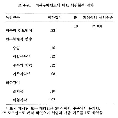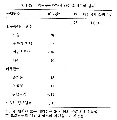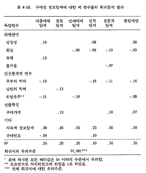 ÀǺ¹°ü¿© ¿Ü¿¡µµ Àα¸Åë°èÀû º¯¼ö·Î¼ ³ªÀÌ¿Í Ãë¾÷À¯¹«, ÁÖºÎ¿Í ³²ÆíÀÇ ÇзÂ, ¿ùÆò±Õ ¼öÀÔ, Áö¿ª, ±×¸®°í »óǰƯ¡À¸·Î¼ ÀǺ¹ÀÇ ±¸¸Å°¡°Ý, ±× ¿Ü¿¡ Áö¼ÓÀû Á¤º¸Å½»ö°ú ±¸¸Åºóµµ¸¦ µ¶¸³º¯¼ö·Î ÇÏ¿© ±¸¸ÅÀü Á¤º¸Å½»ö¿¡ ´ëÇÑ ´Ü°èÀû ȸ±ÍºÐ¼®À» ½Ç½ÃÇÏ¿´À¸¸ç ±× °á°ú´Â Ç¥ 4-18°ú °°´Ù.