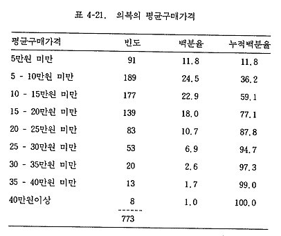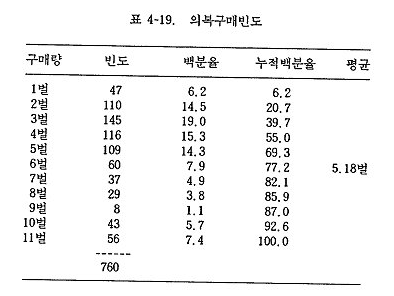 1990³â 1¿ùºÎÅÍ 10¿ù±îÁö ÅõÇǽº, ¿øÇǽº, ºí¶ó¿ì½º, ½ºÄ¿Æ®, ¹ÙÁö ÄÚÆ®, ÀðÄÏÀÇ ÃÑ ±¸¸Åºóµµ¸¦ Á¶»çÇÑ °á°ú´Â Ç¥ 4-19¿Í °°´Ù.