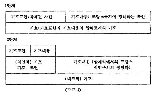 ¹Ù¸£Æ®ÀÇ ÀÌ °³³äÀ» Paris MatchÀÇ Ç¥Áö »çÁøÀ» ¿¹·Î µé¾î ºÐ¼®ÇÏ¸é ´ÙÀ½°ú °°´Ù. Ç¥ÁöÀÇ »çÁøÀº ÇÁ¶û½º ±¹±â¿¡ ´ëÇØ °æ·Ê¸¦ Çϰí ÀÖ´Â ÈæÀκ´»ç¸¦ ÂïÀº °ÍÀ̾ú´Ù. ¿©±â¿¡¼ 1´Ü°èÀÇ ±âȣǥÇöÀº Ç¥Áö¿¡ ½Ç¸° »çÁø, Áï º¹Á¦µÈ »çÁøÀÌ¸ç ±âÈ£³»¿ëÀº 'ÇÁ¶û½º ±¹±â¿¡ °æ·ÊÇÏ´Â ÈæÀÎ'À¸·Î ´ÙÀ½°ú °°ÀÌ µµÇ¥È µÉ ¼ö ÀÖ´Ù.36)