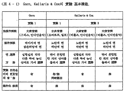 µÑ°, ¹«Á¶°ÇÀڱذú Á¶°ÇÀڱؿ¡ º¯È¸¦ ÁÖ¾ú´Ù. ¼ÙÀÚÀÇ ¼±È£´Â ½Ã°£ÀÇ °æ°ú¿Í Àå¼Ò, ±×¸®°í Ç¥º»¿¡ µû¶ó º¯ÈµÇ±â ¶§¹®¿¡ ÀÌÀü ¿¬±¸ÀÇ °¢ ÀÚ±ØÀ» ±×´ë·Î »ç¿ëÇÏÁö ¾Ê°í º» ¿¬±¸ÀÇ Ç¥º»À» ´ë»óÀ¸·Î ÇÑ ¿¹ºñÁ¶»ç¸¦ °ÅÃÄ ÀÚ±ØÀ» ´Ù½Ã ¼±ÅÃÇÏ¿´´Ù. Kellaris¿Í Cox µµ ¿¹ºñÁ¶»ç¸¦ °ÅÃÄ GornÀÇ Àڱذú´Â ´Ù¸¥ ÀÚ±ØÀ» ¼±ÅÃÇÏ¿´°í, Allen °ú Madden(1985) ¿ª½Ã GornÀÇ Á¶°ÇÀÚ±Ø ¼±È£µµ¸¦ ´Ù½Ã ½ÇÇèÇÏ¿© ¹àÀº ÆÄ¶õ»ö ÆæÀÌ º£ÀÌÁö»ö º¸´Ù ´õ ¼±È£µÊÀ» ¾Ë¾Æ³»°í ¿¹ºñÁ¶»ç¸¦ °ÅÃÄ ³ì»ö°ú °ËÁ¤»ö ÆæÀ» Á¶°ÇÀÚ±ØÀ¸·Î »ç¿ëÇÏ¿´´Ù.49) º» ½ÇÇè¿¡¼´Â ¿¹ºñÁ¶»ç¸¦ ÇÑ °á°ú Á¶°ÇÀÚ±ØÀ¸·Î´Â Çϴûö°ú ¿¬µÎ»ö º¼Ææ, ½ÇÇè 1¿¡¼ÀÇ ±àÁ¤Àû ¹«Á¶°ÇÀÚ±ØÀ¸·Î´Â ¸¶ÀÌŬ Àè½¼(Michael Jackson)ÀÇ À½¾Ç°ú ºÎÁ¤Àû ÀÚ±ØÀ¸·Î´Â ÄÜÆ¼³ÙÆ® ³Ñ¹ö ½Ä½º(Continent No. 6)ÀÇ À½¾Ç, ½ÇÇè 2¿¡¼ÀÇ ±àÁ¤Àû ¹«Á¶°ÇÀÚ±ØÀ¸·Î´Â ¸ðÂ¥¸£Æ®(Mozart)ÀÇ À½¾Ç°ú ºÎÁ¤Àû ÀÚ±ØÀ¸·Î´Â Â÷ÀÌÄß½ºÅ°(Tschikowsky)ÀÇ À½¾ÇÀÌ »ç¿ëµÇ¾ú´Ù. °¢ ÀÚ±ØÀÇ º¯È ³»¿ëÀº º» 4Àå 2Àý¿¡ ÀÚ¼¼È÷ ±â¼úÇÏ¿´´Ù.