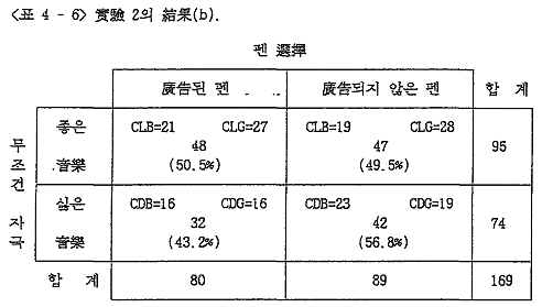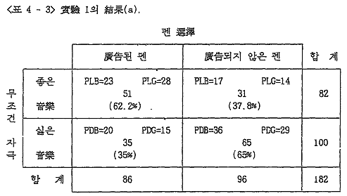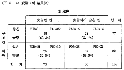 Á¶°Ç PLB¿Í PLB¸¦ ¦Áö¾î ÁÁÀº À½¾Ç(Black or white)¸¦ µéÀº Áý´Ü, Á¶°Ç PDB¿Í PDG¸¦ ¦Áö¾î ½ÈÀº À½¾Ç(Eh Yeh Oh)¸¦ µéÀº Áý´ÜÀ¸·Î ±¸ºÐÇÏ¿´À» ¶§, ÁÁÀº À½¾ÇÀ» µéÀº Áý´Ü¿¡¼´Â ½½¶óÀ̵å·Î ³ëÃâµÈ º¼Ææ(±¤°í µÈ º¼Ææ)À» ´õ ¸¹ÀÌ ¼±ÅÃÇÏ¿´°í (82¸í Áß 51¸í:62.2%), ½ÈÀº À½¾ÇÀ» µéÀº Áý´Ü¿¡¼´Â ½½¶óÀ̵å·Î ³ëÃâµÇÁö ¾ÊÀº º¼Ææ(±¤°í µÇÁö ¾ÊÀº º¼Ææ)À» ´õ ¸¹ÀÌ ¼±ÅÃÇÏ¿´´Ù. (100¸íÁß 65¸í:65%), ÀÌ·¯ÇÑ °á°ú¸¦ Á¤¸®Çϸé <Ç¥ 4-3>°ú °°´Ù.