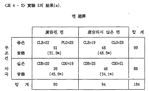 ¶ÇÇÑ ÀÌ µÎ ´ëÁßÀ½¾ÇÀÌ Ææ ±¤°í¿¡ ÀûÀýÇÏÁö ¾ÊÀº ÀÚ±ØÀÏ ¼öµµ ÀÖ´Ù. ½ÇÇè½ÃÁ¡Àº 1989³âÀÌ°í ½ÇÇè´ë»óÀÌ ¸¶ÄÉÆÃ ¼ö¾÷À» µè´Â ÇкΠÇлýµéÀÎ Á¡À» °¨¾ÈÇÒ ¶§ ºñƲÁîÀÇ À½¾ÇÀÌ Ææ ±¤°íÀÇ ±àÁ¤Àû ¹«Á¶°ÇÀÚ±ØÀ¸·Î ¾²¿´´Ù´Â °ÍÀº Á¶±Ý ºÎÀûÀýÇÑ Àڱؿ¬°áÀ̶ó´Â °¡´É¼ºÀÌ ÀÖ´Ù. ºñƲÁî(The Beatles)´Â 1960³â´ë Á¸ÀçÇÏ¿© Àα⸦ ¾ò¾ú´ø ±×·ìÀ̰í Áö±ÝÀº ÇØÃ¼µÇ¾î Ȱµ¿À» Çϰí ÀÖÁö ¾Ê´Ù. ¹°·Ð ¹Ì±¹¿¡¼´Â ÇöÀç±îÁö °è¼Ó ÀαⰡ Áö¼ÓµÇ°í ÀÖ´Ù°í ÇÏÁö¸¸ °íÀüÀ½¾Çµµ ¾Æ´Ï°í À¯Çà¿¡ ¹Î°¨ÇÑ ´ëÁß À½¾Ç¿¡¼ ¹ßÇ¥µÈ Áö ¹«·Á 20³â Á¤µµ µÇ´Â °îÀÌ °ú¿¬ Á¶°ÇÈ È¿°ú¸¦ À¯¹ß½Ãų ¼ö ÀÖÀ» Á¤µµÀÇ ÁÁÀº ±âºÐÀ» ´À³¢°Ô ÇÏ¿© ÁÖ´ÂÁö´Â Àǹ®ÀÌ °¡´Â Á¡ÀÌ´Ù. ÀÌ¿Í °°Àº ÀÌÀ¯ ¶§¹®¿¡ Kellaris¿Í CosÀÇ ¿¬±¸¿¡¼´Â Á¶°ÇÈ È¿°ú°¡ ¹ß°ßµÇÁö ¾Ê¾ÒÀ» °¡´É¼ºÀÌ ÀÖ´Ù.