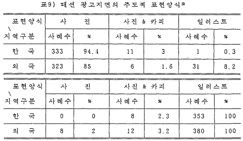 ¿µ»óÀÇ Ç¥Çö Çü½ÄÀº Ç¥ 10)À» º¸¸é »óǰÁ¦½Ã°¡ ´ëºÎºÐ ÀÌ¿ëµÇ´Âµ¥ ¿ì¸®³ª¶óÀÇ ±¤°í´Â ¹è°æ¾øÀÌ »óǰ¸¸ Á¦½ÃµÇ°Å³ª °Å¸®, ½£ µî ´Ü¼øÇÑ ¹è°æÀ¸·Î Á¦½ÃµÇ´Â °æ¿ì°¡ ´Ù¼öÀÌ´Ù. ±×·¯³ª ¿Ü±¹ÀÇ °æ¿ì¿¡´Â ÆÐ¼Ç¼î³ª ȸéÀÇ È¸ÈÀû Áú°¨Ã³¸®, ¸ðµ¨ÀÇ ´Ù¾çÇÑ ¾ó±¼Ç¥Á¤ ¿¬Ãâµî °¨°¢Àû Á¦½Ã¿Í ºÒ°¡´ÉÇÒ Á¤µµÀÇ ´Ù¾çÇÑ Ç¥Çö ¹æ¹ýÀÌ µ¿¿øµÇ°í ÀÖ´Ù.14)