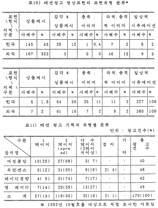 Ç¥ 11Àº ÆÐ¼ÇÁ¦Ç°ÀÇ ÀâÁö¿¡ °ÔÀçµÇ°í ÀÖ´Â ±¤°íÀÇ ±âȹ À¯Çüº° ºÐ·ùÁ¶»çÇÑ °ÍÀÌ´Ù. ÀϹÝÀûÀÎ Æ÷¸Ë(format)ÀÌ ÁÖ¸¦ ÀÌ·ç°í ÀÖÀ¸³ª 3ÆäÀÌÁö ÀÌ»óÀÇ ´Ù¼öÆäÀÌÁö Àü·«À¸·Î ¼ÒºñÀÚ¿¡°Ô ±â¾ï½Ã۰íÀÚ ÇÏ´Â ±¤°íµµ ´«¿¡ ¶ç°Ô ³ªÅ¸³ª°í ÀÖ´Ù. »çÁø 12 ¸¶ÀÎ (MINE) ±¤°í¿Í »çÁø 13 ½Ã½ºÅÛ (SYSTEM) ±¤°í´Â ´Ù¼öÆäÀÌÁö Àü·«À¸·Î ¹ÌÈ¥Áö¸¦ µ¶Á¡Çϰí ÀÖ´Â ±¤°íÀÌ´Ù. ±×·¯³ª ÀÌ·¸°Ô ´Ù¼öÆäÀÌÁöÀÇ ±¤°í°ÔÀç ¿äûÀ» ÆÐ¼ÇÁ¦Ç° ȸ»ç¸¶´Ù ÇØ¿Â´Ù¸é ±× ¸¸Å ÀâÁö³» ±¤°í·®Àº ´Ã¾î ³ª°Ô µÇ°í ±¤°í¿ä±Ý ÀλóÀÇ ¿äÀÎÀÌ µÉ »Ó¸¸ ¾Æ´Ï¶ó ¼ö¿ëÀÚÀÇ ´«¿¡ ¶ç±â´Â ´õ¿í Èûµé¾î Áú °ÍÀÌ´Ù.