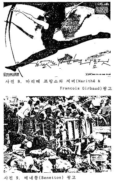 ÇöÀç ³ªÅ¸³ª´Â ¾ç»óÁß ¼öÀÔÀÇ·ù ºê·£µå°¡ ¸¹ÀÌ ³»¼ö ÆÇ¸ÅµÇ°í Àִµ¥ ±×µé ±¤°íÀÇ Ç¥ÇöÀ» º¸¸é ºê·£µå À̹ÌÁö¸¦ °ÇÏ°Ô ³ªÅ¸³»°í ÀÖ´Ù. »çÁø 8´Â '¸¶¸®¶¼ ÇÁ¶û¼Ò¿Í Àú¹ö(Marithe & Francois Girbaud)'ÀÇ ±¤°íÀÌ°í »çÁø 9´Â º£³×Åë ±¤°í·Î ºê·£µå À̹ÌÁö¸¦ °ÇÏ°Ô ³ªÅ¸³»°í ÀÖ´Ù. Ç¥Çö¹æ¹ýÀ¸·Î´Â »çÁø¿µ»ó°ú ºê·£µå¸í, Á¤º¸¸¸À» Á¦½ÃÇÏ¿© ³»¿ëÀ» ³ª¿ÇÏ´ø ±âÁ¸ÀÇ ±¤°í¿Í´Â ´Ù¸¥ ¼¼·ÃµÊÀ» º¸¿© ÁÖ°í ÀÖ´Ù.