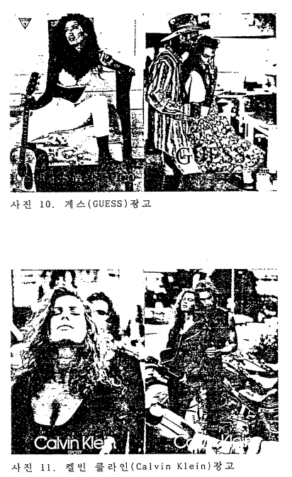 ÃÖ±Ù ³ªÅ¸³ª´Â °æÇâÀ¸·Î ÆÐ¼Ç±¤°í »çÁø¿¡ Èæ¹é ¹× Æ÷ÀÎÆ® Ä®¶ó¸¦ »ç¿ëÇϴµ¥ Ä®¶ó»çÁø¿¡¼ÀÇ ½Ä»óÇÔÀ» Å»ÇÇÇÏ¿© ½Å¼±°¨À» ÁÖ°í ÀÖ´Ù. Èæ¹éÀº À¯Çà¿¡ ±¸¾ÖµÇÁö ¾Ê´Â »öÀ¸·Î Áø(jean)À̳ª Ŭ·¡½Ä(classic) ºê·£µåÀÇ À̹ÌÁö Àü´Þ¿¡ È¿°úÀûÀÌ¶ó º¼¼ö ÀÖ´Ù. ¹°·Ð ÀÌ·¯ÇÑ Çü½ÄÀ» µû¸£´Â ±¤°í°¡ ¸¹¾ÆÁú¼ö·Ï Â÷º°È¿¡ ¹«¸® °¡ ÀÖÀ» ¼öµµ ÀÖ´Ù. »çÁø 10°ú »çÁø 11Àº °Ô½º(GUESS)¿Í Ä̺óŬ¶óÀÎ(Calvin Klein) ±¤°íÀÌ´Ù. ÀÌ µÎ ±¤°íÀÇ °æ¿ì °øÅëÀûÀ¸·Î ¼½½º¾îÇÊÀ» ÇϰíÀÖ´Â Èæ¹é±¤°í·Î ºê·£µå¸íÀ» »èÁ¦ÇÏ°Ô µÇ¸é ±¸º°ÀÌ Èûµé´Ù.