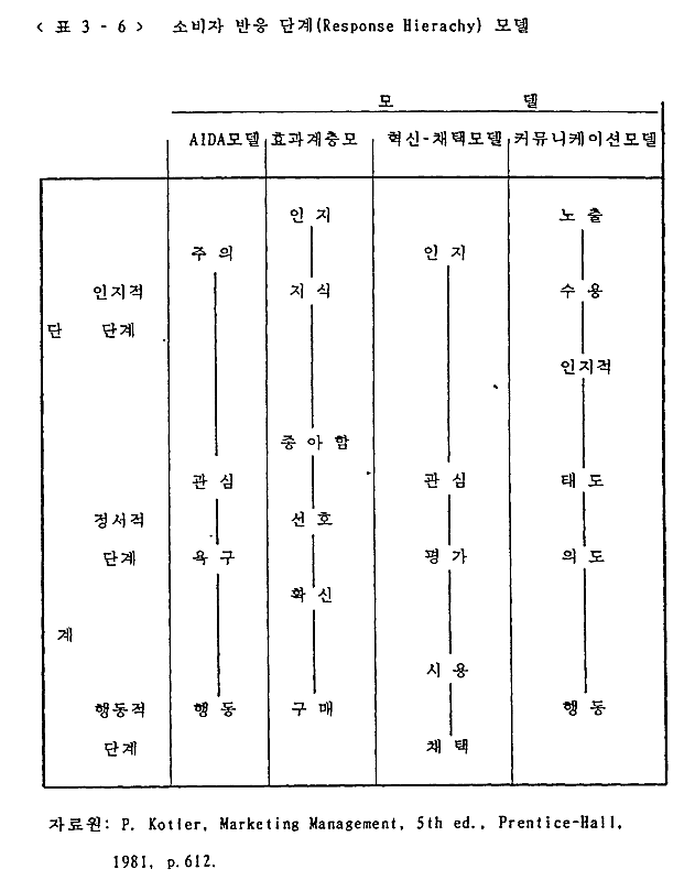 ¼ÒºñÀÚ°¡ ¿ÜºÎÀÇ ¾î¶² Àڱؿ¡ ´ëÇØ ¹ÝÀÀÇÏ´Â °úÁ¤À» ¼³¸íÇÏ´Â ¿©·¯°¡Áö ¸ðµ¨ÀÌ °³¹ßµÇ¾ú´Âµ¥ ±× Áß¿¡¼ ³× °¡Áö°¡ ´ëÇ¥ÀûÀ¸·Î ¾Ë·ÁÁø °ÍÀÌ´Ù. AIDA ¸ðµ¨Àº ¼ÒºñÀÚ°¡ ÁÖÀÇ(attention or awareness), °ü½É(interest), ¿å±¸(desire), Çൿ(action)ÀÇ ´Ü°èµéÀ» °ÅÃİ¡°í ÀÖÀ½À» º¸¿©ÁØ´Ù. È¿°ú °èÃþ¸ðµ¨(hierarchy-of-effects model) ¼ÒºñÀÚ°¡ ÀÎÁö(awareness), Áö½Ä(knowledge), ÁÁ¾ÆÇÔ(liking), ¼±È£(preference), È®½Å(convictions), ±×¸®°í ±¸¸Å(purchase)ÀÇ ´Ü°è¸¦ °ÅÄ¡°í ÀÖÀ½À» ³ªÅ¸³½´Ù. Çõ½Å-äÅøðÅÚ(innovation-adoption model)Àº ÀÎÁö(awareness), °ü½É(interest), Æò°¡(evaluation), ½Ã¿ë(trial), äÅÃ(adoption)ÀÇ ´Ü°è·Î ¼ÒºñÀÚ°¡ ¹ÝÀÀÇÔÀ» º¸¿©ÁØ´Ù. ±×¸®°í Ä¿¹Â´ÏÄÉÀÌ¼Ç ¸ðµ¨(communication model)Àº ¼ÒºñÀÚ°¡ ³ëÃâ(exposure), ¼ö¿ë(reception), ÀÎÁöÀû ¹ÝÀÀ(cognitive response), ŵµ(attitude), Àǵµ(intention), Çൿ(behavior) µîÀÇ ´Ü°è·Î ¹ÝÀÀÇÔÀ» ³ªÅ¸³»°í ÀÖ´Ù. ÀÌ·¯ÇÑ ³× °¡Áö ¸ðµ¨Àº ¾ð¾îÀû Ç¥ÇöÀÌ ´Ù¸¦ »Ó, ´ëü·Î ºñ½ÁÇѵ¥ ±× ÀÌÀ¯´Â ¹ÝÀÀ °èÃþ ¸ðÅÚµéÀÌ ¸ðµÎ ´ÙÀ½°ú °¥Àº °¡Á¤À» Çϰí Àֱ⠶§¹®ÀÌ´Ù. ±× °¡Á¤Àº ¾î¶² ÀÎÁöÀûÀÎ(cognitive) Ȱµ¿ -ºñÆò°¡ÀûÀÎ »ç°í-ÀÌ Á¤¼Àû ¹ÝÀÀ(affective activity)À» ¾ß±â½Ã۰í À̰ÍÀº ´Ù½Ã ÇൿÀûÀÎ(behavioral, conative) ¹ÝÀÀ-ÇൿÀÇ °èȹ ȤÀº Çൿ ±× ÀÚü¿¡ ¿µÇâÀ» Áشٰí ÇÏ´Â °ÍÀÌ´Ù. 31) ÀÌ·¯ÇÑ ±¸¸ÅÀÚÀÇ ½É¸®°úÁ¤ Áï ±¸¸ÅÇൿ°úÁ¤ÀÇ ÁøÀü¿¡ µû¶ó °¢ ÃËÁø ¼ö´ÜÀÇ È¿°ú°¡ ´Þ¶óÁö°Ô µÈ´Ù.