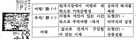 µµÇü(½Ã°£)°ú ±×¸²¿©ÇàÀÌ Á÷Á¢ÀûÀÎ °ü·ÃÀº ¾øÀ¸³ª, ÀÌÁ© ¼Ó ¿©ÀÎ(±¤°í °æ°ü ¼ÓÀÇ ¹èÁö)À» ÅëÇØ ±×¸²¿©Çà(±¤°í °æ°üÀÇ µµÇü)°ú ½Ã°£(±¤°íÀÚüÀÇ µµÇü)Àº Çϳª·Î ¿¬°áµÇ°í ÀÖ´Ù. ÀÌ·¸µí ÀüÇô °ü°è¾ø´Â °æ°üÀÇ À̹ÌÁö°¡ °£Á¢ÀûÀ¸·Î ÀÌÁßÀÇ ¿©°ú (filtering)À» ÅëÇØ »óÈ£°ü·Ã¼ºÀ» ´À³¢°Ô ÇÑ´Ù. ÀÌ·¯ÇÑ F/G X ±¤°í¿¡¼´Â ÁÖ·Î Àΰ£ÀÇ ³»¸é¼¼°è(±â¾ï, Ãß¾ï)¿Í °¨Á¤(»óÄèÇÔ)µî°ú °ü·ÃµÈ schema¸¦ ÅëÇØ Ç¥ÇöÇϰí ÀÖ´Ù.
