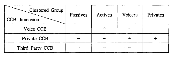 The dimension structure of the CCB was validated by pooling the data. The dtmensions were 1) Voice CCB 2) Private CCB 3) Third Party CCB. And by the standardized factor score of these dimemsions, respondents were clustered into four groups.