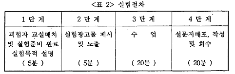 ½ÇÇè ´ë»óÀڵ鿡°Ô´Â °¢ ±¤°í¹°À» Àдµ¥ Page´ç 1ºÐ¾¿ ÇÒ´çÇÏ¿´´Ù. ¸ðµç ±¤°í¹°À» º¸°í³ ÈÄ¿¡´Â ¹èÆ÷µÈ ±¤°í¹°À» ȸ¼öÇÏ¿´°í, ´ÙÀ½¿¡´Â Á¤»óÀûÀ¸·Î ¼ö¾÷À» ÁøÇàÇÏ¿´´Ù. ¾à 20ºÐ Á¤µµÀÇ ¼ö¾÷À» ÁøÇàÇÑ ÈÄ ½ÇÇè ´ë»óÀڵ鿡°Ô ¼³¹®Áö°¡ ¹èÆ÷µÇ¾ú°í, ÀÚÀ¯·Î¿î ºÐÀ§±â¿¡¼ ¼³¹®Áö¿¡ ÀÀ´äÇϵµ·Ï ÇÏ¿´´Ù. ½ÇÇè¿¡ ¼Ò¿äµÈ ½Ã°£Àº ¾à 50ºÐ À̾ú´Ù. ½ÇÇèÀýÂ÷¸¦ ¿ä¾àÇÏ¿© ±â¼úÇϸé <Ç¥ 2>¿Í °°´Ù.