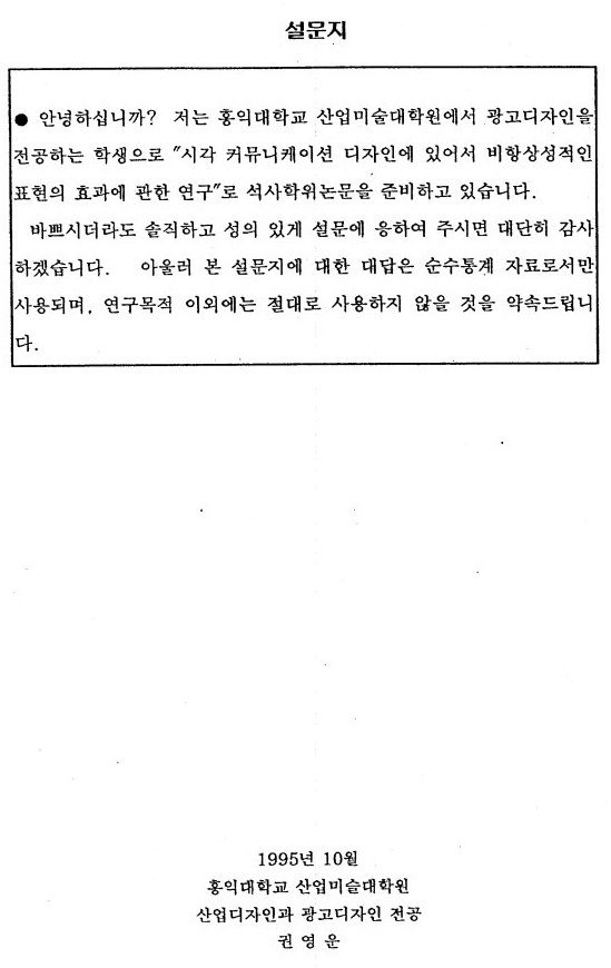 The modern society toward 21C is organizing environment for communication newly with reatstrides of science and pluralistic aspects of culture. Progress of mechanical thechnique has brought on development of media, which has been funning the ability and type of communication to deliver information miraculously. Inthe type of delivering information. The area of visual communication is taking a enlarged role according as an expressive type has changed into visual language-centered from letter-centered.
