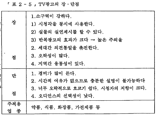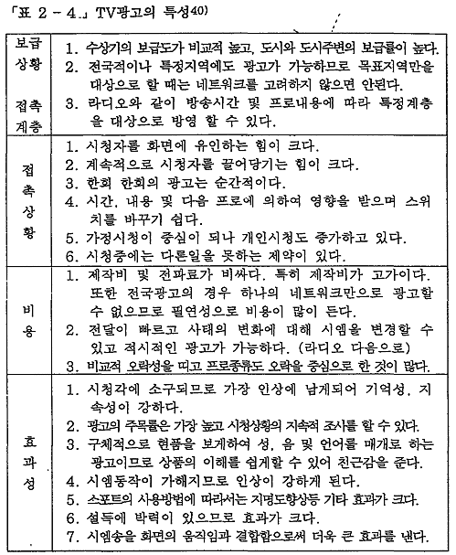 ¿À´Ã³¯ ½Å¹®°ú ÇÔ²² °¡Àå ³Î¸® Ȱ¿ëµÇ°í ÀÖ´Â TV´Â ½Ã°¢(sight)°ú û°¢(sound), »öä(color), µ¿ÀÛ(motion) µîÀ» µ¿½Ã¿¡ Ȱ¿ëÇϱ⠶§¹®¿¡ ¶óµð¿À, ±ØÀå, ¿µÈ¸¦ °áÇÕÇÑ °Í°ú °°´Ù. TV´Â ±¤°íÁÖ°¡ Á¦½ÃÇÏ´Â Á¦Ç°À» ½Ç°¨ÀÖ°Ô Ç¥ÇöÇÒ ¼ö ÀÖ´Â ´ëÁ߸Åü·Î ±¤°íÁÖ°¡ ¸¹Àº »ç¶÷µé¿¡°Ô ½±°Ô Á¢±ÙÇÒ ¼ö ÀÖ´Â ¹æ¹ýÀ» Á¦°øÇÑ´Ù. ¶ÇÇÑ TV´Â ¶óµð¿ÀÀÇ µ¿½Ã¼º°ú Àμâ¸Åü°¡ °¡Áö´Â ½Ã°¢Àû°¡Ä¡¿¡ µû¸¥ ¼³µæ·Â¿¡ Á¦Ç°½Ç¿¬(product demonstration)°ú °ßº»Á¦°øÀÌ ÃÊÄ¡ÇÏ´Â ÆÇ¸ÅâÁ¶Àû °ú¸¦ °áÇÕÇÑ °Í°ú °°Àº ¼º°ÝÀ» °®°í Àֱ⠶¼¹®¿¡ ¶óµð¿Àº¸´Ù ¾à 9¡10¹è °¡·® °·ÂÇÑ Ãæ°ÝÀ» ¼ÒºñÀÚ¿¡°Ô ¾È°ÜÁØ´Ù.38)