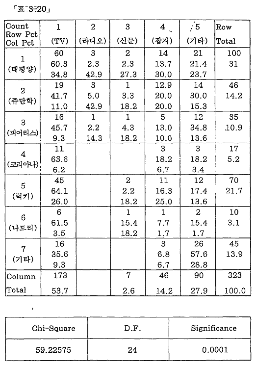 <Ç¥ 3-22>¿¡¼ °¡·ÎÀÇ ¼ýÀÚ´Â Á÷¾÷º° º¯ÀÎÀ¸·Î½á 1Àº ´ëÇлý, 2´Â Á÷ÀåÀÎ, 3Àº °¡Á¤ÁֺεéÀ» ³ªÅ¸³»¸ç, ¼¼·ÎÀÇ ¼ýÀÚ´Â ±¤°í¸ÅüÀÇ º¯ÀÎÀ¸·Î½á 1Àº TV, 2´Â ¶óµð¿À, 3Àº ½Å¹®, 4´Â ÀâÁö, 5´Â ±âŸ¸¦ ³ªÅ¸³½´Ù.