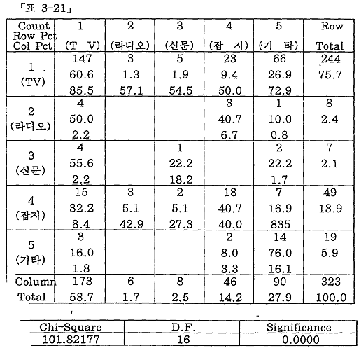 <Ç¥ 3-21>¿¡¼ÀÇ °¡·ÎÀÇ ¼ýÀÚ´Â ±¸¸ÅÀÚÀÇ ±¸ÀÔ¸ÅüÀÇ ±¤°íº¯ÀÎÀ» ³ªÅ¸³»¸ç ¼¼·ÎÀÇ ¼ýÀÚ´Â ±¸¸ÅÀÚÀÇ Á¢Ã˱¸¸Å ±¤°íº¯ÀÎÀ¸·Î¼ °¡·Î, ¼¼·Î ¼ýÀÚ´Â °°ÀÌ 1Àº TV, 2´Â ¶óµð¿À, 3Àº ½Å¹®, 4´Â ÀâÁö, 5´Â ±âŸ¸¦ ³ªÅ¸³½´Ù.