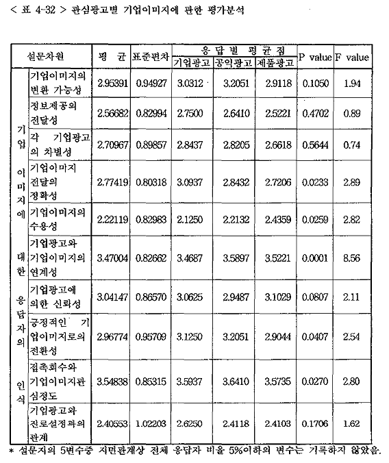 ¿©·¯ Á¾·ùÀÇ ±¤°íÁß¿¡¼ ±â¾÷±¤°í¿¡ °üÇÑ °ü½ÉÀ» ¾Ë¾Æº¸·Á´Â ¼ÒºñÀÚÀÇ ÀϹÝÀû ÀνÄÀÇ ¹®Ç×°ú ±â¾÷±¤°íÀÇ ±â´É¿¡ °üÇÑ ¼ÒºñÀÚ Æò°¡¿ÍÀÇ °ü°è¸¦ À¯ÀǼöÁØ 5%·Î ºÐ¼®ÇÑ ³»¿ëÀº <Ç¥ 4-32>¿Í °°ÀÌ ³ªÅ¸³µ´Ù. ±â¾÷À̹ÌÁö Àü´ÞÀÇ Á¤È®¼º¿¡ °üÇÑ Æò°¡¹®Ç×, ±â¾÷À̹ÌÁö¿Í ¼ö¿ë¼º, ±â¾÷±¤°í¿Í ±â¾÷À̹ÌÁöÀÇ ¿¬°è¼º, ±â¾÷±¤°í¿¡ ÀÇÇÑ ±â¾÷¿¡ ´ëÇÑ ½Å·Ú¼º, ±àÁ¤ÀûÀÎ ±â¾÷À̹ÌÁö·ÎÀÇ Àüȯ°¡´É¼º, ±â¾÷±¤°í¿ÍÀÇ Á¢ÃËȸ¼ö¿¡ ÀÇÇÑ ±â¾÷À̹ÌÁö¿¡ ´ëÇÑ °ü½ÉÁ¤µµÀÇ Æò°¡¹®Ç׿¡¼ Åë°èÀûÀ¸·Î À¯ÀǼºÀÌ Á¸ÀçÇÏ´Â °ÍÀ» ¹ß°ßÇÑ ¼ö°¡ ÀÖ¾ú°í, ³ª¸ÓÁöÀÇ ±â´É¿¡¼´Â À¯ÀǼºÀÌ ³ªÅ¸³ªÁö ¾Ê¾Ò´Ù, ¶Ç °ü½É±¤°íº¯ ±â´É¿¡ °üÇÑ ÀÀ´äÆò±ÕÀ» º¸¸é, ±â¾÷±¤°í¿¡ ÀÀ´äÇÑ Áý´ÜÀÌ 3.9710 , °øÀͱ¤°í°¡ 2.9519, Á¦Ç°±¤°í¿Í Áý´ÜÀÌ 2,8766·Î ³ªÅ¸³ª¹Ç·Î¼, Àü¹ÝÀûÀ¸·Î ±â¾÷±¤°í¿¡ °ü½ÉÁ¤µµ°¡ ³ôÀº ¼ÒºñÀÚµéÀÌ ±â¾÷±¤°íÀÇ ±â´É¿¡ ´ëÇÑ Æò°¡¿¡ À־µ ±àÁ¤ÀûÀÎ ÀÎÁö¸¦ Çϰí ÀÖ´Ù°í ºÐ¼®ÀÌ µÈ´Ù.