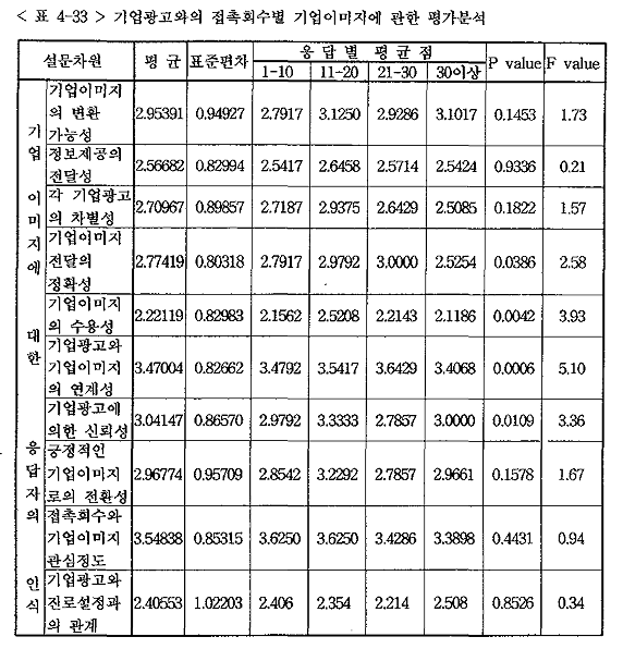 ±â¾÷±¤°í¿ÍÀÇ Á¢ÃËȸ¼ö¸¦ ¹¯´Â ¼ÒºñÀÚÀÇ ÀϹÝÀû ÀÎ½Ä¿Ü ¹®Çаú ±â¾÷À̹ÌÁö¿¡ °üÇÑ ¼ÒºñÀÚ Æò°¡¿ÍÀÇ °ü°è¸¦ À¯ÀǼöÁØ 5%·Î ºÐ¼®ÇÑ ³»¿ëÀº < Ç¥ 4-33 >°ú °°ÀÌ ³ªÅ¸³µ´Ù. ±â¾÷À̹ÌÁö Àü´ÞÀÇ Á¤È®¼º, ±â¾÷À̹ÌÁöÀÇ ¼ö¿ë¼º, ±â¾÷±¤°í¿Í ±â¾÷À̹ÌÁöÀÇ ¿¬°è¼º, ±â¾÷±¤°í¿¡ ÀÇÇÑ ½Å·Ú¼º, Á¢ÃËȸ¼ö¿Í ±â¾÷À̹ÌÁö °ü½ÉÁ¤µµÀÇ Æò°¡ ¹®Ç׿¡ ÀÖ¾î¼ Åë°èÀûÀ¸·Î À¯ÀǼºÀÌ Á¸ÀçÇÏ´Â °ÍÀ» ¹ß°ßÇÒ ¼ö°¡ ÀÖ¾ú°í, ³ª¸ÓÁöÀÇ ±â´É¿¡¼´Â À¯ÀǼºÀÌ ³ªÅ¸³ªÁö ¾Ê¾Ò´Ù. ¶Ç Á¢ÃËȸ¼öº° ±â¾÷À̹ÌÁö¿¡ ´ëÇÑ Æò°¡ÀÇ ÃÑÀÀ´äÆò±ÕÀ» º¸¸é, 1 - 10¹ø Á¤µµ Á¢ÃËÇØ º» Áý´ÜÀÌ ±â¾÷±¤°íÀÇ ±â´É¿¡ °üÇÑ Æò°¡ÀÀ´ä¿¡ ÀÖ¾î¼ Æò±Õ 2.8344 , 11 - 20¹ø Á¤µµÀÇ Áý´ÜÀÌ 3.0292 , 21 - 30¹ø Á¤µµÀÇ Áý´ÜÀÌ 2.8214·Î ³ªÅ¸³µ°í 30¹øÀÌ»óÀÇ Á¢ÃËÀ» Çß´Ù°í ÀÀ´äÇÑ Áý´ÜÀÌ Æò±Õ 2.8067·Î ³ªÅ¸³²À¸·Î¼, Àü¹ÝÀûÀ¸·Î º¼ ¶§ ±â¾÷±¤°íÀÇ ±â´É¿¡ °üÇÑ Æò°¡´Â Á¼Àº ÆøÀÇ ´ëºñ¸¦ º¸À̹ǷΠ±â¾÷±¤°íÀÇ Á¢ÃËȸ¼öÀÇ Áõ°¡¿¡ µû¶ó ºñ·ÊÀûÀ¸·Î Áõ°¡ÇÏÁö ¾ÊÀ¸¸ç, ±â¾÷±¤°í¿ÍÀÇ Á¢ÃËÀÌ 11-20¹ø Á¤µµÀÇ Áý´ÜÀÌ °¡Àå ³ôÀº Æò±Õ Á¡¼ö¸¦ ³ªÅ¸³»°í ÀÖ¾ú´Ù.