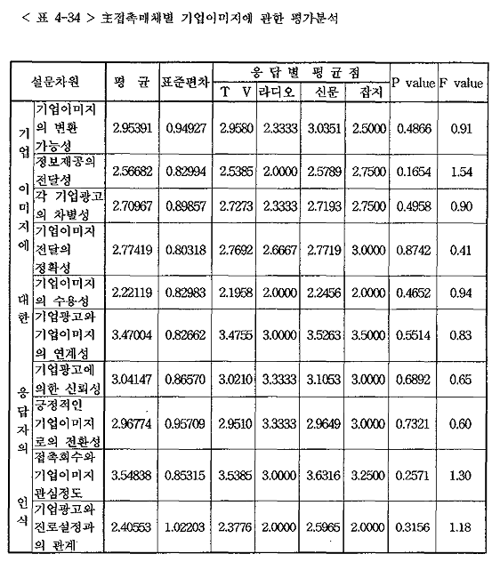 ±â¾÷±¤°í¿ÍÀÇ ÁÖÁ¢Ã˸Åü¸¦ ¹¯´Â ¼ÒºñÀÚÀÇ ÀϹÝÀû ÀνÄÀÇ ¹®Ç×°ú ±â¾÷±¤°í¿¡ µû¸¥ ±â¾÷À̹ÌÁö¿¡ ´ëÇÑ ¼ÒºñÀÚ Æò°¡¿ÍÀÇ °ü°è¸¦ À¯ÀǼöÁØ 5%·Î ºÐ¼®ÇÑ ³»¿ëÀº < Ç¥4-34 >¿Í °°ÀÌ ³ªÅ¸³µ´Ù. ³»¿ëÀº ±â¾÷À̹ÌÁöÀÇ Àü¹ÝÀûÀÎ Æò°¡¿Í Á¢Ã˸Åüº° À¯ÀǼºÀÌ Á¸ÀçÇÏÁö ¾Ê´Â °ÍÀ¸·Î ¹«ÀǹÌÇϴٴ°ÍÀ» ¹ß°ßÇÒ ¼ö°¡ ÀÖ¾ú´Ù. ¶Ç ÁÖÁ¢Ã˸Åüº° ±â´É¿¡ °üÇÑ ÀÀ´äÆò±ÕÀ» º¸¸é, TVƲ ÁÖÁ¢Ã˸Åü·Î ÀÀ´äÇÑ Áý´ÜÀÌ ±â¾÷±¤°íÀÇ ±â´É¿¡ °üÇÑ Æò°¡ÀÀ´ä¿¡ ÀÖ¾î¼ Æò±Õ 2.8552, ¶óµð¿À¶ó°í ÀÀ´äÇÑ Áý´ÜÀÌ 2.5999 , ½Å¹®À» ÁÖÁ¢Ã˸Åü¶ó°í ´ë´äÇÑ Áý´ÜÀÌ 2.9175·Î ³ªÅ¸³µ°í, ÀâÁö¶ó°í ´ë´äÇÑ ÀÀ´äÀÚµéÀÌ Æò±Õ 2.7750À¸·Î ³ªÅ¸³ªÀ¸·Î¼ Àü¹ÝÀûÀ¸·Î ÁÖÁ¢Ã˸Åü¿¡ ¸¶¸¥ ±â¾÷À̹ÌÁöÀÇ ±â´É¿¡ °üÇÑ Æò°¡´Â ½Å¹®¿¡ ÀÇÇÑ ±â¾÷±¤°íÀÇ Á¢ÃËÀÌ ±â¾÷±¤°íÀÇ ±â´É¿¡ °üÇÑ Æò°¡¿¡ °¡Àå ±àÁ¤ÀûÀÎ ¿µÇâÀ» ¹ÌÄ£´Ù°í ºÐ¼®µÇ¾úÀ¸¸ç, ±× ´ÙÀ½ÀÌ TV, ÀâÁö, RADIOÀÇ ¼øÀ§·Î ÃÑÆò±ÕÁ¡¼ö°¡ ³ªÅ¸³µ´Ù.
