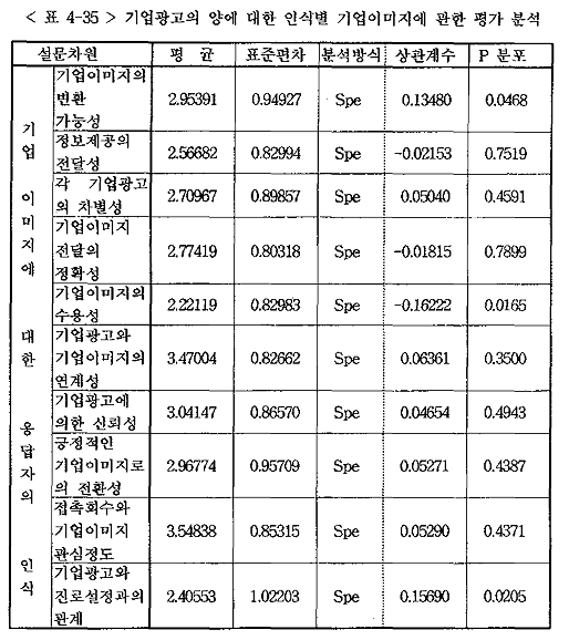 ´Ù¸¥ ¿©·¯ ±¤°í¿Í ºñ±³½Ã, ±â¾÷±¤°íÀÇ ¾çÀÇ Áõ°¡¿¡ °üÇÑ °ü½ÉÀ» ¾Ë¾Æº¸·Á´Â ¼ÒºñÀÚÀÇ ÀϹÝÀû ÀνÄÀÇ ¹®Ç×°ú ±â¾÷±¤°íÀÇ ±â´É¿¡ °üÇÑ ¼ÒºñÀÚ Æò°¡¿ÍÀÇ °ü°è¸¦ À¯ÀǼöÁØ 5%·Î ºÐ¼®ÇÑ ³»¿ëÀº <Ç¥ 4-35>¿Í °°ÀÌ ³ªÅ¸³µ´Ù. ±â¾÷±¤°í¿¡ ÀÇÇÑ ±â¾÷À̹ÌÁöÀÇ º¯È¯°¡´É¼º°ú ±â¾÷Á¤º¸Á¦°øÀÇ Àü´Þ¼º ±×¸®°í ±â¾÷À̹ÌÁö¿¡ ´ëÇÑ ¼ÒºñÀÚÀÇ ¼ö¿ë¼ºÀ» ¹¯´Â ¹®Ç׿¡¼ ¸¸ÀÌ À¯ÀǼº¸¸ÀÌ ³ªÅ¸³µÀ» »Ó ³ª¸ÓÁö ¹®Ç׿¡ ´ëÇØ¼´Â ÀüÇô À¯ÀÇÀûÀÎ Àǹ̰¡ ¾ø´Â °ÍÀ¸·Î ³ªÅ¸³µ´Ù.