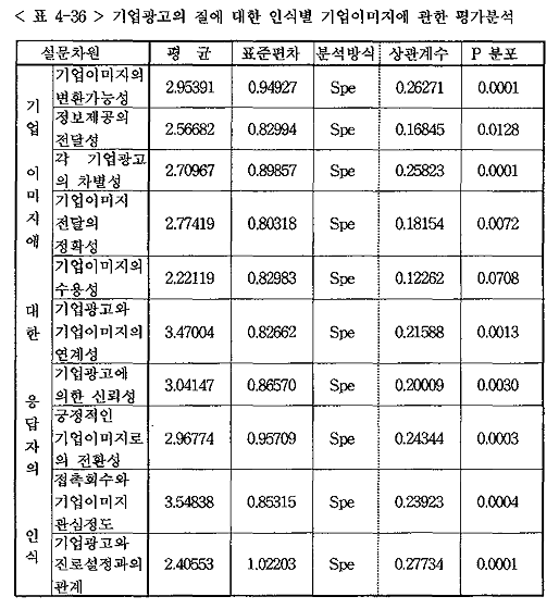 ´Ù¸¥ ¿©·¯ ±¤°í¿Í ºñ±³½Ã, ±â¾÷±¤°íÀÇ Áú¿¡ °üÇÑ ¼ÒºñÀÚ¿Í ÀϹÝÁ÷ ÀνÄÀÇ Æò°¡¹®Ç×°ú ±â¾÷±¤°í¿¡ µû¸¥ ±â¾÷À̹ÌÁö¿¡ °üÇÑ ¼ÒºñÀÚ¿Í Æò°¡¿ÍÀÇ °ü°è¸¦ À¯ÀǼöÁØ 5%·Î ºÐ¼®ÇÑ ³»¿ëÀº < Ç¥ 4-36 >°ú °°ÀÌ ³ªÅ¸³µ´Ù. ±â¾÷±¤°íÀÇ Áú¿¡ °üÇÑ Æò°¡´Â ±â¾÷À̹ÌÁö¿¡ °üÇÑ ÀÀ´äÀÚÀÇ ÀνÄÀ» ¹¯´Â Â÷¿øÀÇ ¸ðµç ¼³¹®¹®Ç×°úÀÇ ºÐ¼®¿¡¼ »ó´çÇÑ ¼öÁØÀÇ À¯ÀǼºÀÌ °ËÁõµÇ¾úÀ¸¸ç, µÎ Â÷¿ø°£ÀÇ °ü°è ¶ÇÇÑ »ó´çÈ÷ ¹ÐÁ¢ÇÑ Á¤ÀÇ »ó°ü°ü°è·Î ³ªÅ¸³µ´Ù.