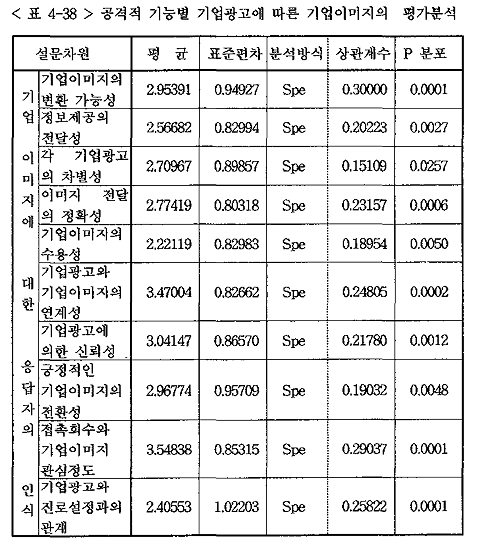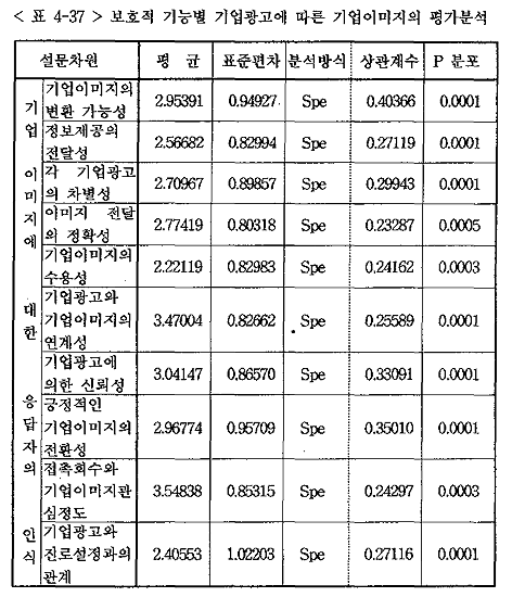 ±â¾÷±¤°íÀÇ ±â´ÉÁß º¸È£Àû ±â´É¿¡ °üÇÑ ¼ÒºñÀÚÀÇ Æò°¡¿Í ±â¾÷±¤°í¿¡ ÀÇÇØ ¼ÒºñÀÚµéÀÌ »ý°¢Çϰí ÀÎÁöÇϰí ÀÖ´Â ±â¾÷±¤°í¿¡ µû¸¥ ±â¾÷À̹ÌÁö¿¡ ´ëÇÑ Æò°¡¿ÍÀÇ °ü°è¸¦ ±Ô¸íÇϱâ À§ÇØ »ó°ü°ü°è¸¦ À¯ÀǼöÁØ 5%·Î ºÐ¼®ÇÑ °á°ú < Ç¥ 4-37 >°ú °°Àº ºÐ¼®°á°ú¸¦ ³ªÅ¸³Â´Ù.