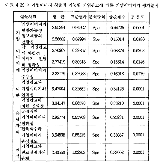 ±â¾÷±¤°íÀÇ ±â´ÉÁß ±â¾÷À̹ÌÁö âÃâ ±â´É¿¡ °üÇÑ ¼ÒºñÀÚ¿Í Æò°¡¿Í ±â¾÷±¤°í¿¡ ÀÇÇØ ¼ÒºñÀÚµéÀÌ »ý°¢Çϰí ÀÎÁöÇϰí ÀÖ´Â ±â¾÷±¤°í¿¡ µû¸¥ ±â¾÷À̹ÌÁö¿¡ ÆÐÇÑ Æò°¡¿ÍÀÇ °ü°è¸¦ ±Ô¸íÇϱâ À§ÇØ »ó°ü°ü°è¸¦ À¯ÀǼöÁØ 5%·Î ºÐ¼®ÇÑ °á°ú, À§ÀÇ < Ç¥ 4-39 >¿Í °°Àº ºÐ¼®°á°ú¸¦ ³ªÅ¸³Â´Ù. µÎ µÎ ¼³¹®Â÷¿ø°£ÀÇ Æò°¡¿¡ ÀÖ¾î¼ ÀÀ´äÀÚµéÀÇ Æò°¡¸¦ À¯Àǵµ °ËÁõÀ» ½Ç½ÃÇÏ¿´´õ´Ï ¸ðµç ¹®Ç׿¡ ´ëÇÏ¿© À¯ÀǼºÀÌ Á¸ÀçÇÔÀÌ Áõ¸íµÇ¾úÀ¸¸ç, »ó°ü°ü°è¿¡ À־µ ´Ù¸¥ Â÷¿øµé°£ÀÇ ºÐ¼®°ú ºñ±³ÇÏ¿© »ó´çÈ÷ ³ôÀº ¼öÄ¡ÀÇ »ó°ü°è¼ö¸¦ º¸ÀÌ´Â Á¤ÀÇ °ü°è¸¦ º¸¿´À¸¸ç, ÀÀ´äÀÚ°¡ ±âÁ¸¿¡ °¡Áö°í ÀÖ´ø ±â¾÷À̹ÌÁö¸¦ º¯È½Ãų ¼ö ÀÖ´Ù´Â Áï ±â¾÷±¤°í°¡ »õ·Î¿î ±â¾÷À̹ÌÁö¸¦ Çü¼º½Ãų ¼ö ÀÖ´Ù´Â ¹®Ç×°ú ±â¾÷À̹ÌÁö âÃâ ±â´ÉÀÇ °ü°è°¡ °¡Àå ¹ÐÁ¢ÇÑ »ó°ü°ü°è¸¦ ³ªÅ¸³Â´Ù.