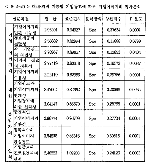 ±â¾÷±¤°íÀÇ ±â´ÉÁß ´ë³»¡¤¿ÜÀû ±â´ÉÁß¿¡¼ ´ë³»·Á Æò°¡¿¡ °üÇÑ ¼ÒºñÀÚÀÇ Æò°¡¿Í ±â¾÷±¤°í¿¡ ÀÇÇØ ¼ÒºñÀÚµéÀÌ »ý°¢Çϰí ÀÎÁöÇϰí ÀÖ´Â ±â¾÷±¤°í¿¡ µû¸¥ ±â¾÷À̹ÌÁö¿¡ ´ëÇÑ Æò°¡¿ÍÀÇ °ü°è¸¦ ±Ô¸íÇϱâ À§ÇØ »ó°ü°ü°è¸¦ À¯ÀǼöÁØ 5%·Î ºÐ¼®ÇÑ °á°ú <Ç¥ 4-40>°ú °°Àº ºÐ¼®°á°ú¸¦ ³ªÅ¸³Â´Ù. µÎ ¼³¹®Â÷¿ø°£ÀÇ Æò°¡¿¡ ÀÖ¾î¼ ÀÀ´äÀÚµéÀÇ Æò°¡¸¦ À¯Àǵµ °ËÁõÀ» ½Ç½ÃÇÏ¿´´õ´Ï ¸ðµç ¹®Ç׿¡ ´ëÇÏ¿© À¯ÀǼºÀÌ ÀÖÀ½ÀÌ Áõ¸íµÇ¾ú´Ù.