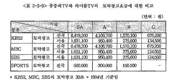 <Ç¥ 2-3-9>¿¡¼ º¸¸é ÄÉÀ̺íTVÀÇ SPORTS ä³Î°ú °øÁ߯ÄTV 3»ç¿Í Àü±¹Áö¿ªÀÇ Å丷±¤°íºñ¸¦ ÇßÀ» ¶§, °øÁ߯ÄTVÀÇ Å丷±¤°í°¡ ¹«·Á 12.9¹èÁ¤µµ ºñ½Î´Ù. À̰ÍÀº ÄÉÀ̺íTV ±¤°íÀÇ °¡Àå ´ëÇ¥ÀûÀΠƯ¡ÀÎ Àú·ÅÇÑ °¡°ÝÀ¸·Î ƯÁ¤ ¼Ò±¸´ë»ó¿¡ ´ëÇÑ ±¤°íÁýÇàÀ» ÇÒ ¶§ Æ´»õ½ÃÀåÀ» È®º¸ÇÒ ¼ö ÀÖÀ½À» ¾Ï½ÃÇϰí ÀÖ´Ù. ±×·¯³ª °£°úÇÏÁö ¸»¾Æ¾ß ÇÒ Á¡Àº ÇöÀçÀÇ ÄÉÀ̺íTV°¡ Á¤»óÀûÀÎ ±¤°í¸Åü·Î¼ Á¦±â´ÉÀ» Çϱâ À§Çؼ´Â ÃæºÐÇÑ °¡ÀÔÀ²À» È®º¸ÇØ¾ß ÇÑ´Ù´Â »ç½Ç¿¡ ÀÖ´Ù. ±×·¡¾ß¸¸ ¾ÕÀ¸·Î ±¤°íºñ¿¡ À־µ ÀûÁ¤ÇÑ °¡°Ý¼öÁØ¿¡¼ ÆÇ¸Å¸¦ ÅëÇØ ±¤°í¼öÀÔÀ» ¿Ã¸± ¼ö ÀÖÀ» °ÍÀÌ´Ù.