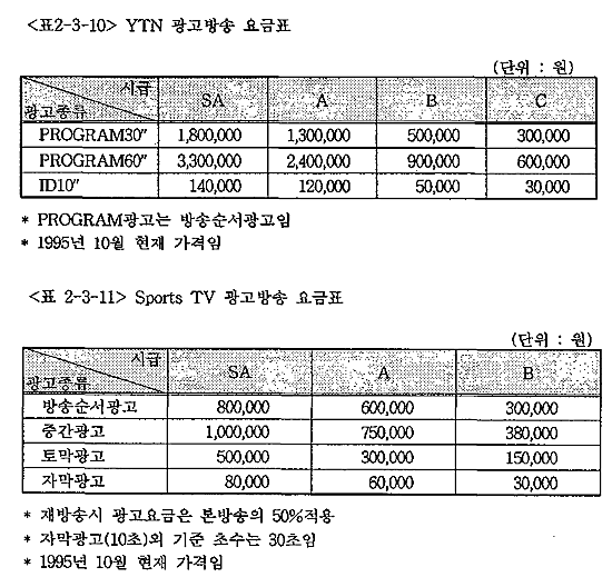 ÇÑÆí ÄÉÀ̺í ä³Î°£¿¡µµ ±¤°í´Ü°¡´Â Çö°ÝÇÑ Â÷À̰¡ Á¸ÀçÇÑ´Ù. ÄÉÀ̺íTV Ãâ¹üÀÌÈÄ °è¼ÓÇØ¼ ±¤°í¸ÅÃâ¾× 1À§¸¦ À¯ÁöÇϰí ÀÖ´Â ¿¬ÇÕTV´º½º(YTN)¿Í ±¤°í¸ÅÃâ¾× ÁßÀ§±ÇÀ» À¯ÁöÇϰí ÀÖ´Â Çѱ¹½ºÆ÷Ã÷(Sports TV)ÀÇ ±¤°í°¡°ÝÀ» Á¤¸®ÇÑ °ÍÀÌ ´ÙÀ½ÀÇ <Ç¥ 2-3-10>¿Í <2-3-11>¿¡¼ Á¤¸®µÇ¾î ÀÖ´Ù. ÀÌ µµÇ¥¸¦ »ìÆì º¸¸é, 30ÃÊÂ¥¸® ¹æ¼Û¼ø¼ ±¤°í¿¡¼ YTN°ú Sport TVÀÇ ±¤°í¿ä±Ý °£¿¡´Â »ó´çÇÑ Â÷À̸¦ º¸À̰í ÀÖ´Ù. SA½Ã±Þ¿¡¼ º¸¸é, YTNÀÌ 180¸¸¿øÀ̰í Sports TV°¡ 80¸¸¿ø ¼öÁØ¿¡¼ °Å·¡µÇ°í ÀÖÀ½À» ¾Ï½ÃÇϰí ÀÖ´Ù.