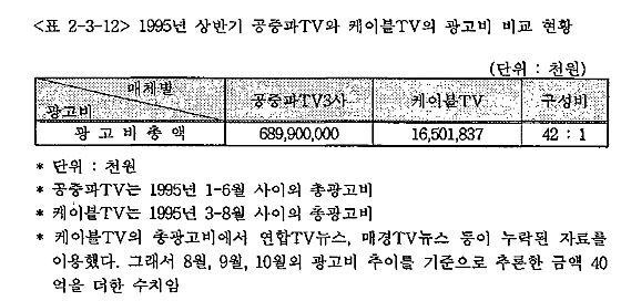 1995³âÀÇ »ó¹Ý±â ¸Åüº° ±¤°í¸¦ ºñ±³ÇØ º¸¸é ´ÙÀ½ÀÇ <Ç¥ 2-3-12>¿¡¼ ¾Ë ¼ö ÀÖµíÀÌ °øÁ߯ÄTVÀÇ ±¤°íºñ°¡ ÄÉÀ̺íTV±¤°íÀÇ ¾à 40¹è Á¤µµ°¡ ¸¹´Ù. ÀÌ·¯ÇÑ ¼öÄ¡¸¦ º¸¸é ÄÉÀ̺íTV°¡ °øÁ߯ÄTVÀÇ °æÀïÀûÀÎ ±¤°í¸Åü·Î¼ ¾ÆÁ÷±îÁö´Â Á¦ÀÚ¸®¸¦ ãÁö ¸øÇßÀ½À» ÀǹÌÇÏ´Â °ÍÀÌ´Ù.