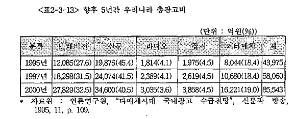 À§ÀÇ <Ç¥ 2-3 13>¿¡¼ º¸µíÀÌ, ÄÉÀ̺íTV¸¦ Æ÷ÇÔÇÑ ±âŸ ¸Åü°¡ 1995³â¿¡ Â÷ÁöÇÒ °ÍÀ¸·Î ¿¹»óµÇ´Â Ãѱ¤°íºñÀÇ ºñÀ²Àº 18.4%ÀÌ´Ù. ±Ý¾×À¸·Î ȯ»êÇϸé 1,975¾ï¿øÀÌ´Ù. ±×¸®°í ±âŸ¸ÅüÀÇ ±¤°í¸ÅÃâ¾×ÀÌ ÇâÈÄ 5³â°£ ¾à 100%Á¤µµ Áõ°¡¸¦ ÀÌ·é´Ù°í ÃßÁ¤ÇØ º¸¸é 2000³â´ë¿¡ °¡¼´Â Àüü¸ÅÃâ¾×¿¡¼ 19%Á¤µµÀÇ ±¸¼ººñ¸¦ Â÷ÁöÇÒ °ÍÀ¸·Î ¿¹°ßµÈ´Ù. ÀÌ ½ÃÁ¡ÀÌ µÇ¾úÀ» ÄÉÀ̺íTV ÀÚü´Â 2-3% ¼öÁØÀÇ Á¡À¯À²À» ±â·ÏÇÏ°Ô µÉ °ÍÀÌ´Ù.41) ÀÌ ¼öÄ¡´Â ÇöÀç ¶óµð¿À°¡ Â÷ÁöÇÏ´Â ±¤°íºñº¸´Ù ÀûÀº 1,400¾ï-2000¾ï¿ø Á¤µµÀÇ ½ÃÀåÀ» Çü¼ºÇÏ´Â °ÍÀÌÁö¸¸, ÀÌ ¶§ºÎÅÍ º»°ÝÀûÀÎ ±¤°í¸Åü·Î¼ ÄÉÀ̺íTV°¡ Á¦¿ªÇÒÀ» ÇÒ ¼ö ÀÖÀ» °ÍÀ¸·Î Àü¸ÁµÈ´Ù.