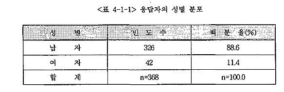 ¸ÕÀú Á¶»ç´ë»óÀÚÀÇ ¼ºº° ºÐÆ÷¸¦ º¸¸é ÃÑ 368¸íÁß¿¡¼ ³²ÀÚ°¡ 326¸í(88.6%), ¿©ÀÚ°¡ 42¸í(11.4%)À¸·Î ³ªÅ¸³µ´Ù. ÀÌó·³ ³²³àÀÇ ºñÀ²ÀÌ ±Ø½ÉÇÑ Â÷À̸¦ º¸ÀÌ´Â °ÍÀº ¿ì¸® k¶ó ±¤°í°ü·Ã Á÷¿øÀÇ ºÒ±ÕÇüÇÑ ¼ººñÀ²À» ¿©½ÇÈ÷ º¸¿©ÁÖ´Â °á°ú¶ó°í ÇÒ ¼ö ÀÖ´Ù.