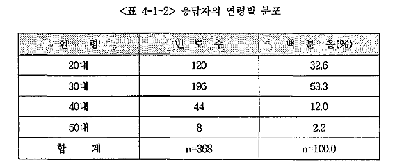 <Ç¥ 4-1-2>´Â ¿¬·Éº° ºóµµ¼ö¸¦ ³ªÅ¸³½ °ÍÀÌ´Ù. ÀÌ °á°ú¿¡ µû¸£¸é 30´ë¶ó°í ÀÀ´äÇÑ »ç¶÷ÀÌ 53.3%·Î °ú¹Ý¼ö ÀÌ»óÀ̾úÀ¸¸ç, ±× ´ÙÀ½ÀÌ 20´ë(32.6%)À̾ú°í 40´ë(12.0%), 50´ë(2.2%) ¼øÀ¸·Î ³ªÅ¸³µ´Ù. Áï Á¶»ç´ë»óÀÚµéÀÇ °ú¹Ý¼ö ÀÌ»óÀÌ Àã¿¡¼ °¡Àå ½Ç¹«¿¡ ¸¹ÀÌ °ü¿©ÇÏ´Â Áý´ÜÀÓÀ» ³ªÅ¸³½´Ù°í ÇÒ ¼ö ÀÖ´Ù.
