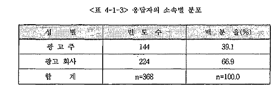 ±¤°íÀÎÀ» ¼Ò¼Ó Áý´Üº°·Î ±¸ºÐÇØ º¸¸é <Ç¥ 4-1-3>¿¡ ³ªÅ¸³ °Íó·³ ±¤°íÁÖ¿¡ ¼Ò¼ÓµÈ »ç¶÷ÀÌ 144¸í(39.1%), ±¤°íȸ»ç¿¡ ¼Ò¼ÓµÈ »ç¶÷ÀÌ 224¸í(66.9%)À¸·Î Á¶»çµÇ¾ú´Ù.